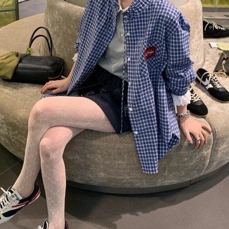 📚 le rouge周美美 复古学院蓝白格子蕾丝拼接贴标抽绳立领防晒衬衫