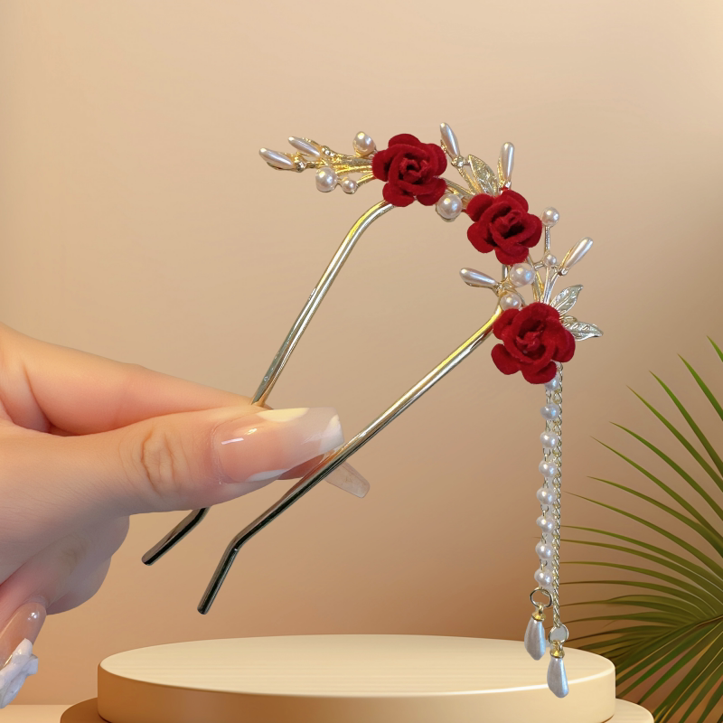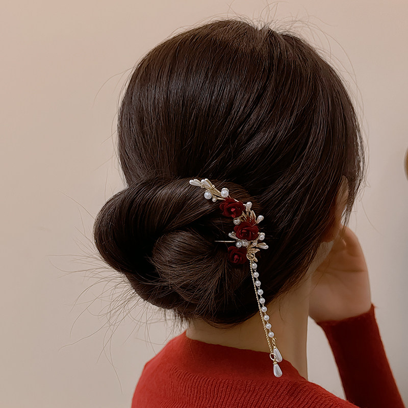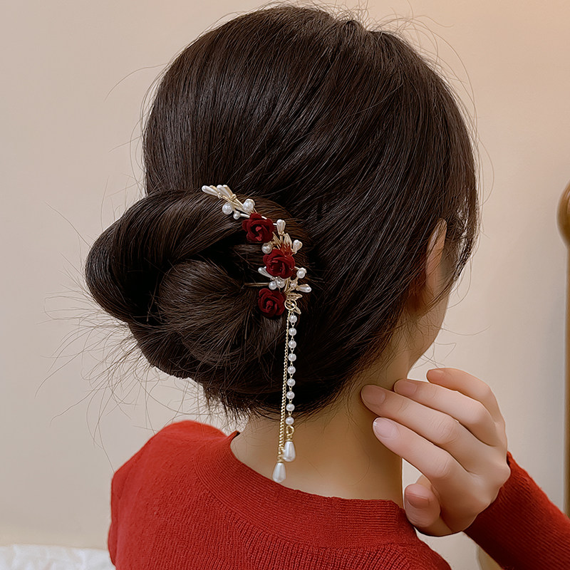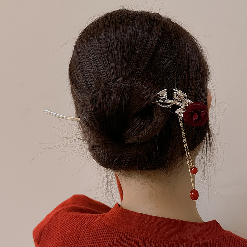 📚 红色新年绒花发簪女后脑勺盘发发钗过年头饰流苏簪子古风旗袍配饰