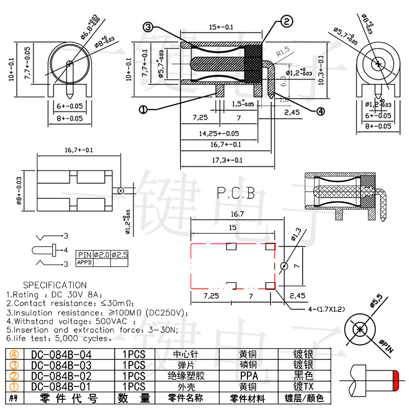 📚 DC-084B弯针卧式插件全金属电源插座 DC电源接5521弯插母座8*16.7