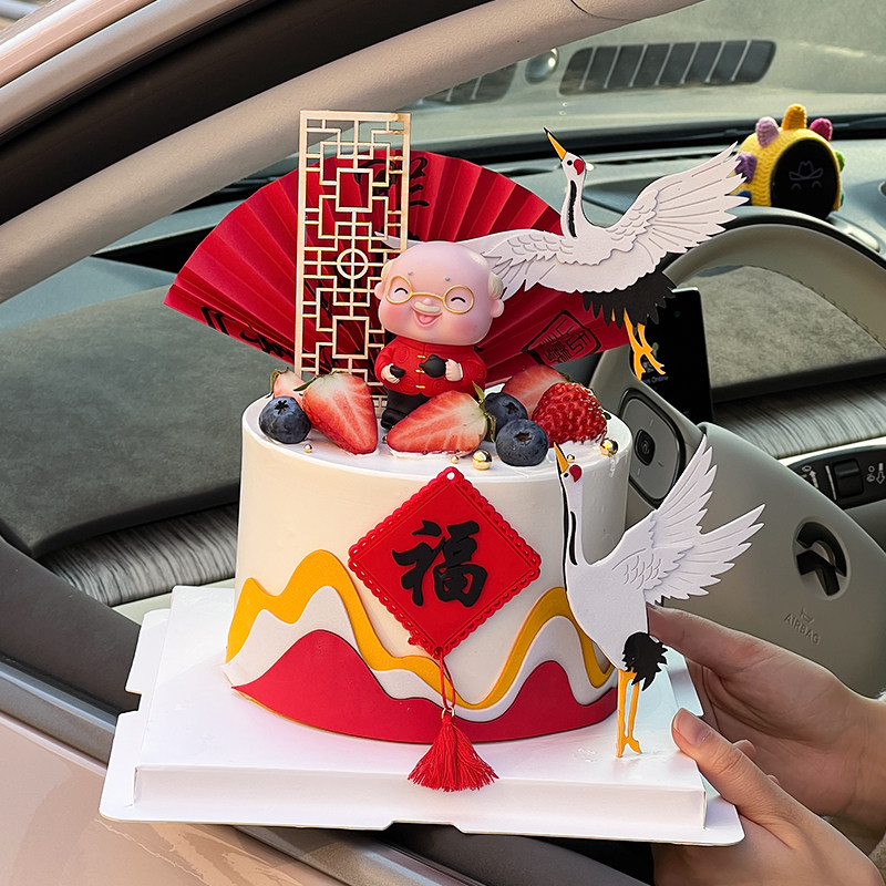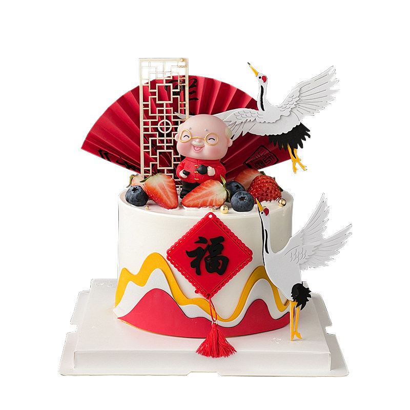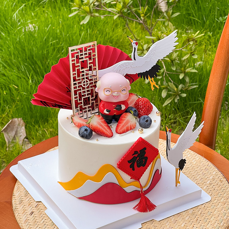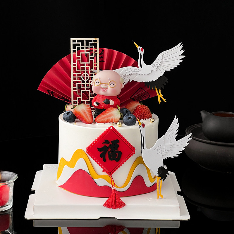 📚 新中式爷爷奶奶祝寿生日蛋糕装饰摆件山峦屏风扇子福字仙鹤插件