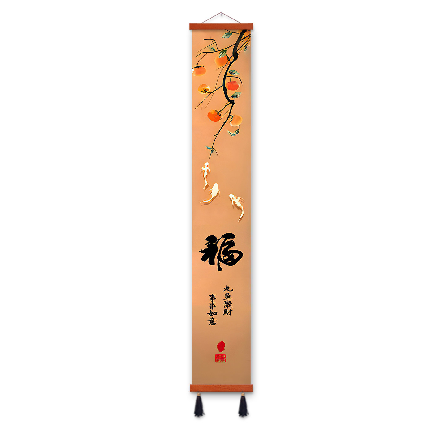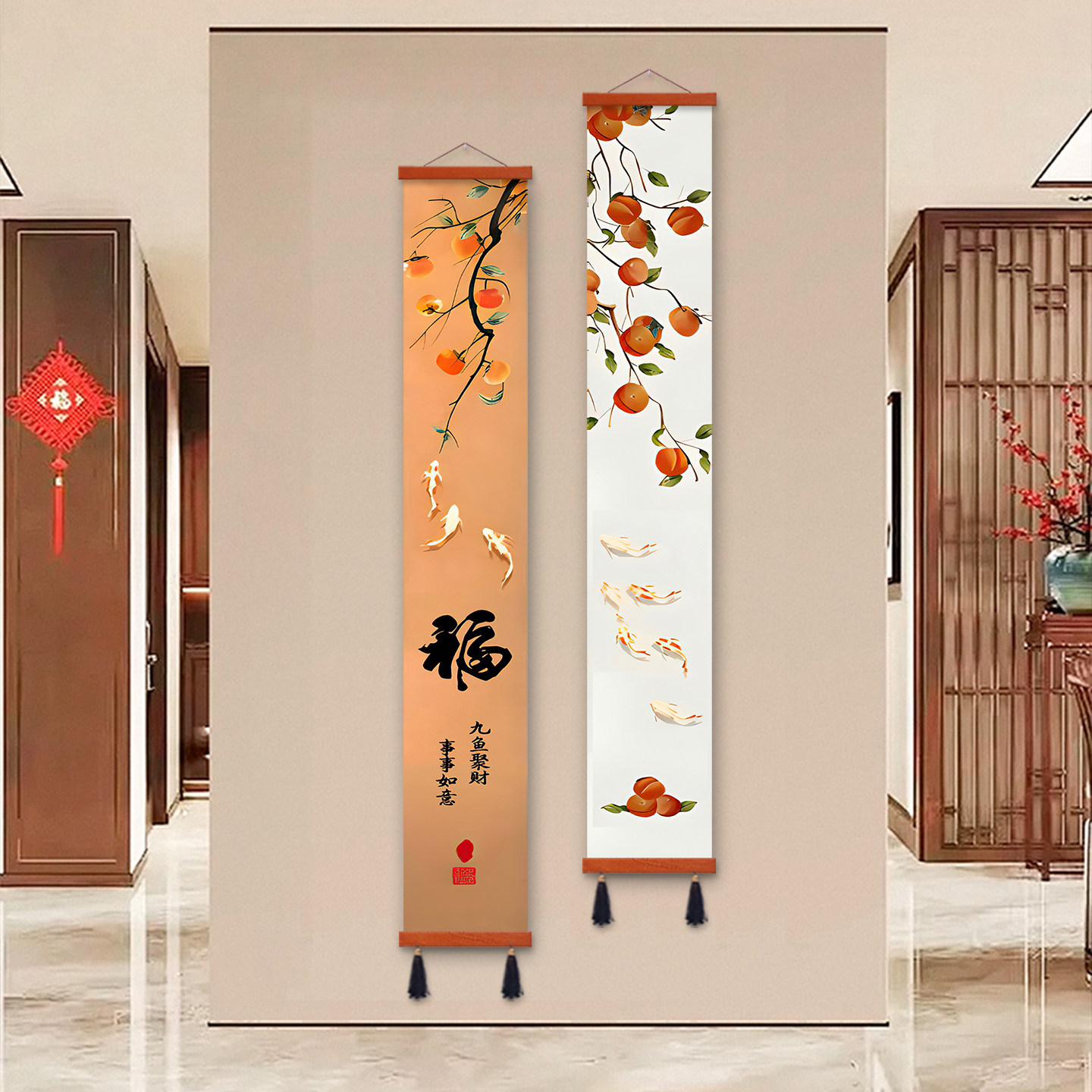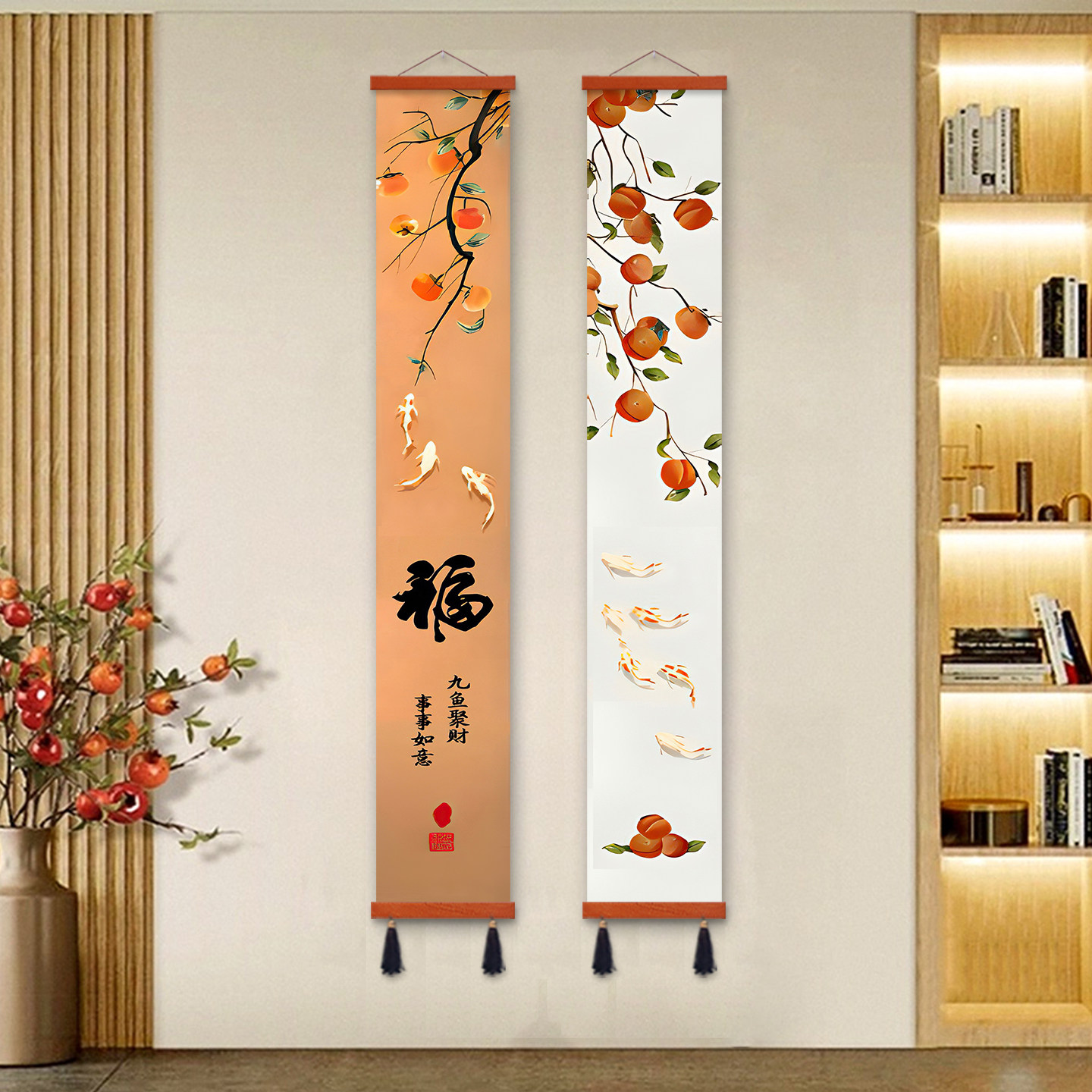 📚 柿柿如意挂画玄关过道装饰画入户门窄长条画新中式九鱼图柿子画