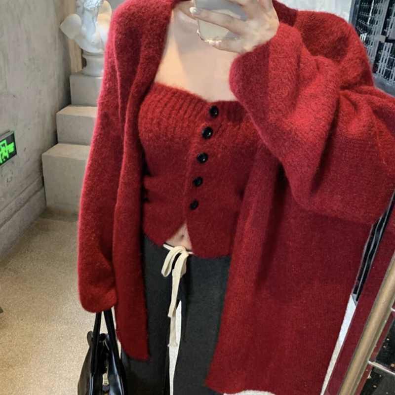 📚 2025秋冬新款圣诞新年抹胸排扣内搭红色毛衣外套两件套慵懒风上衣