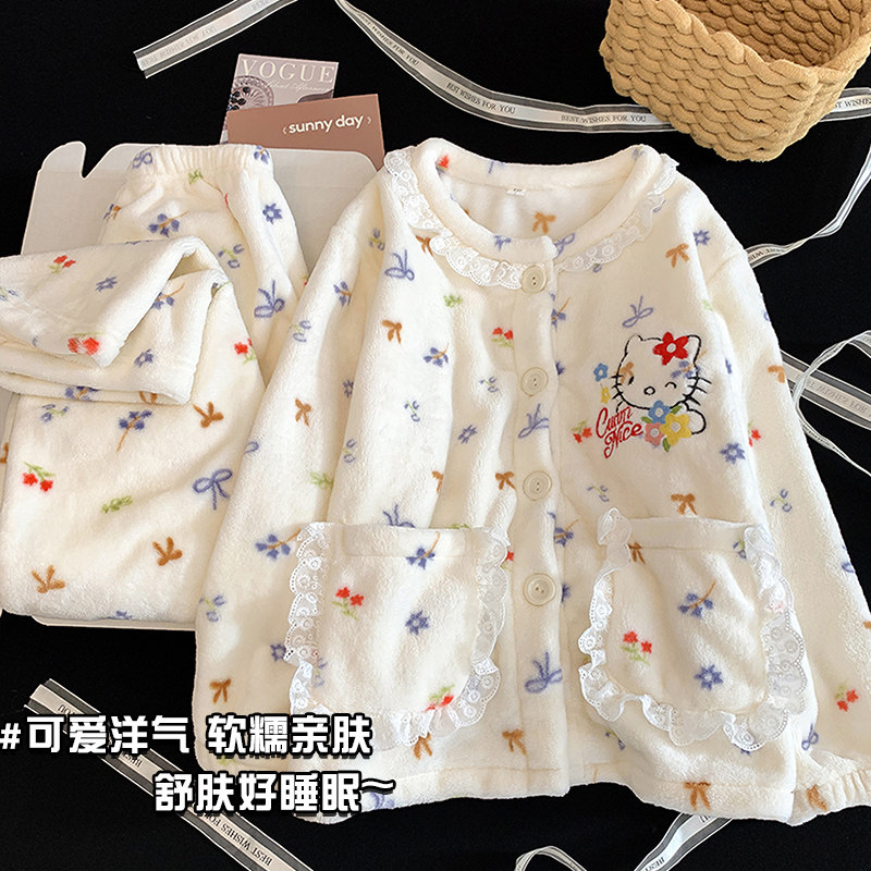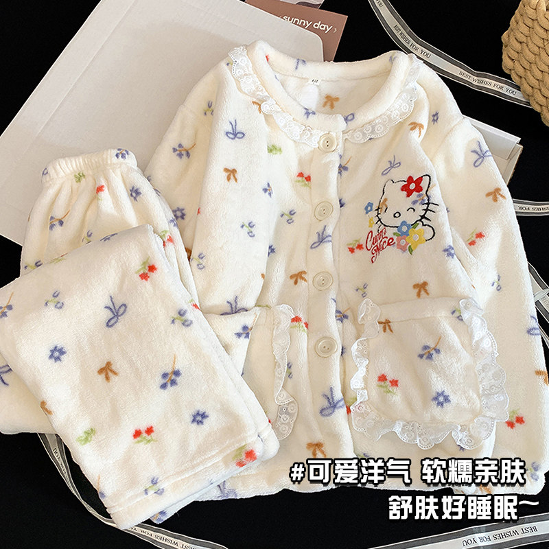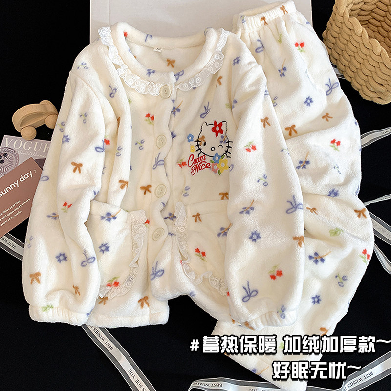 📚 2025儿童保暖珊瑚绒睡衣秋冬季女童法兰绒卡通kt猫冬中大童家居服