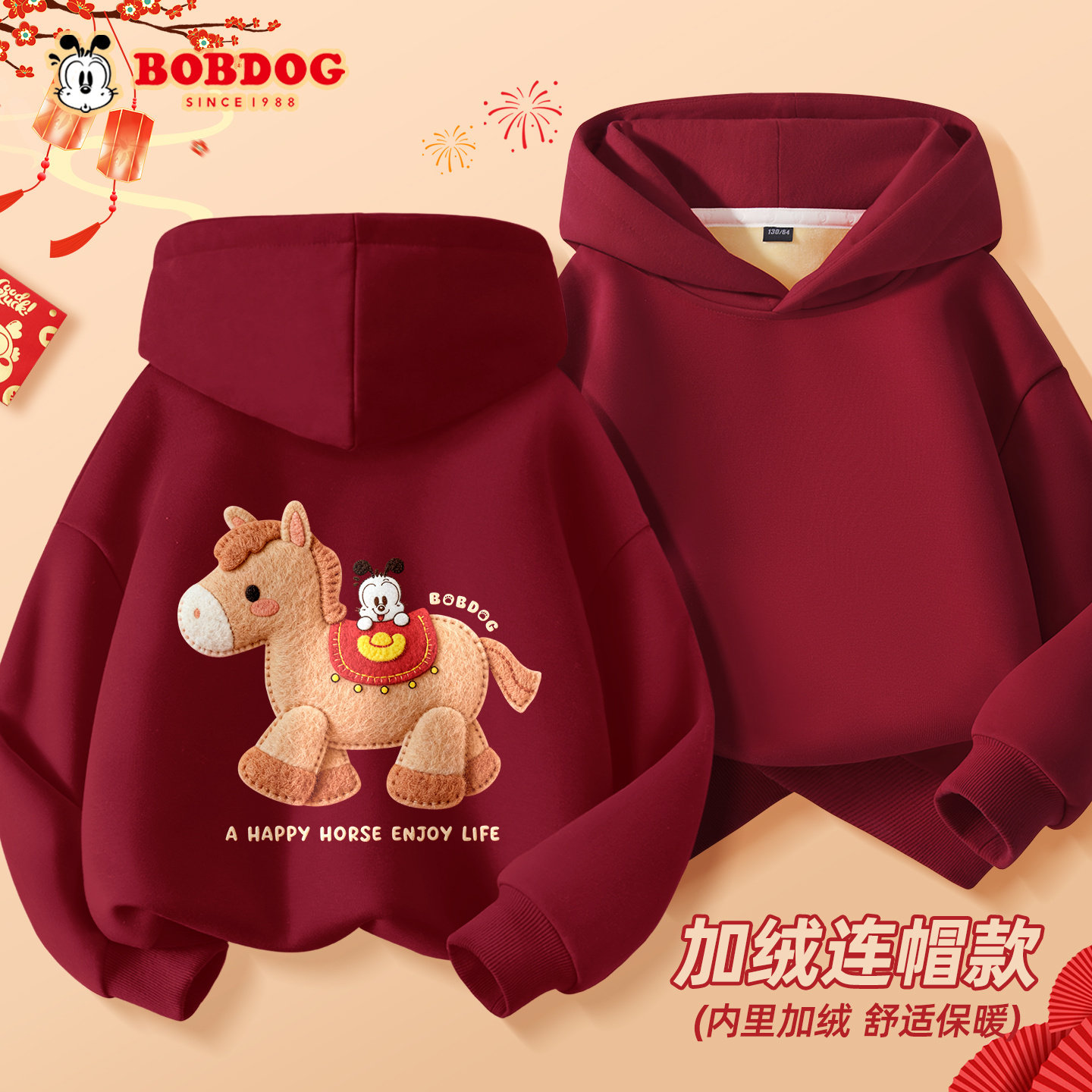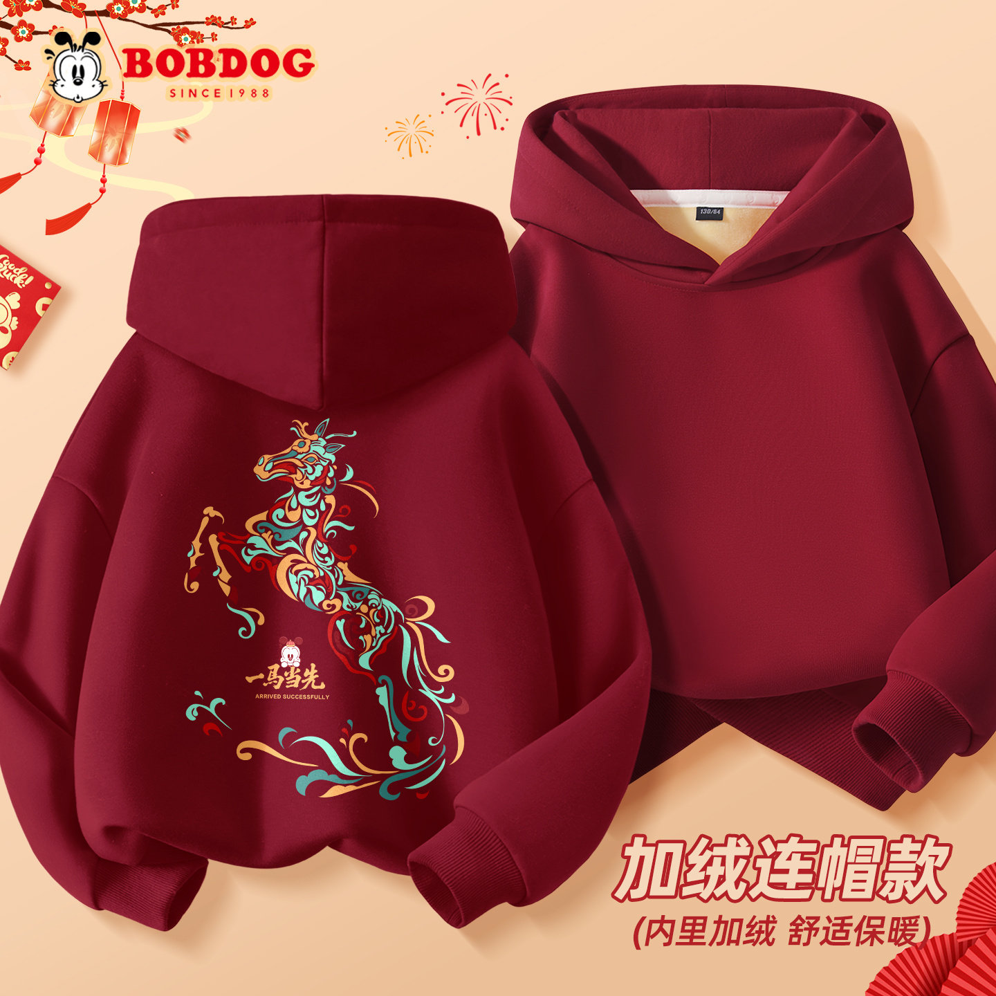 📚 巴布豆女大童卫衣加绒加厚2026新款冬季马年红色拜年服儿童连帽衫