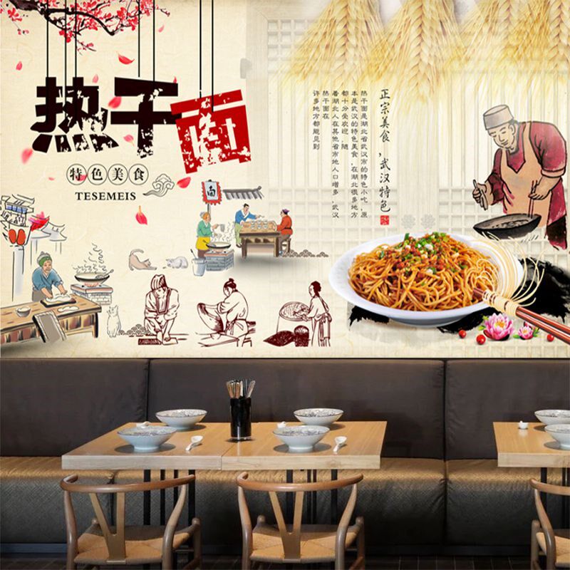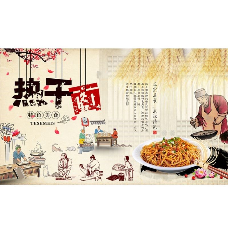 📚 中式热干面壁纸复古怀旧热干面餐厅饭馆砖墙背景面装饰壁画修墙纸