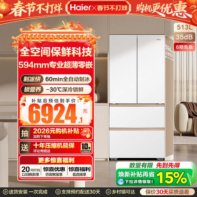 📚 海尔麦浪冰箱513L法式多门自动制冰风冷全空间保鲜超薄零嵌电冰箱