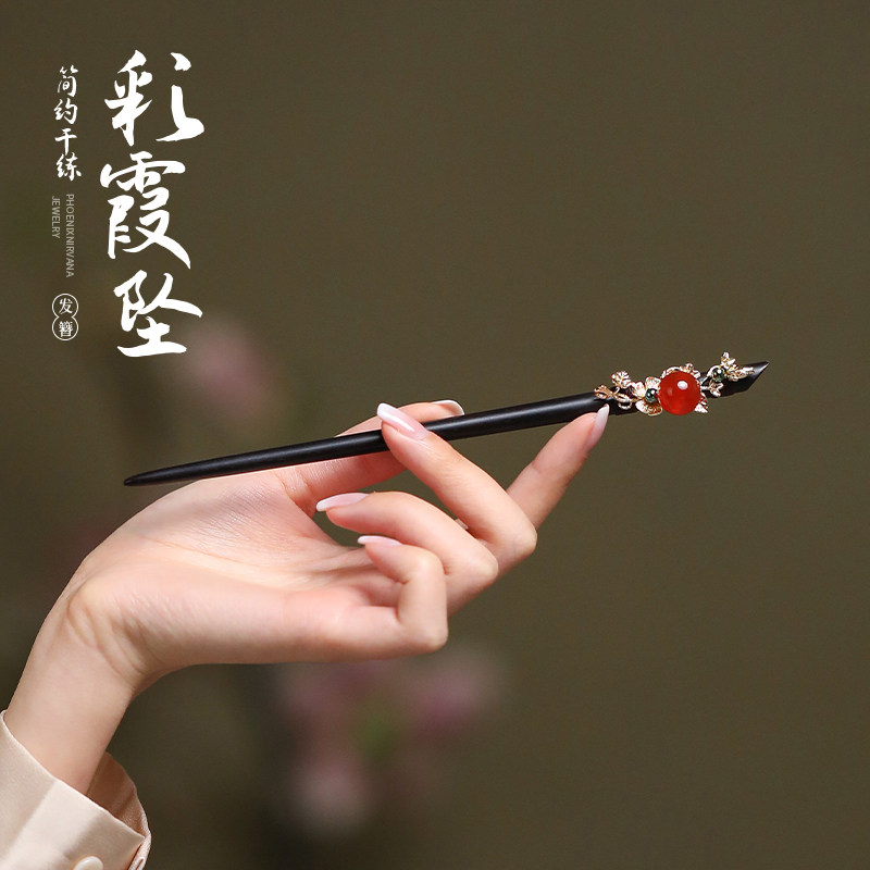 📚 凤凰涅磐发簪古风檀木发饰国风新中式木簪红色玛瑙簪子送闺蜜礼物