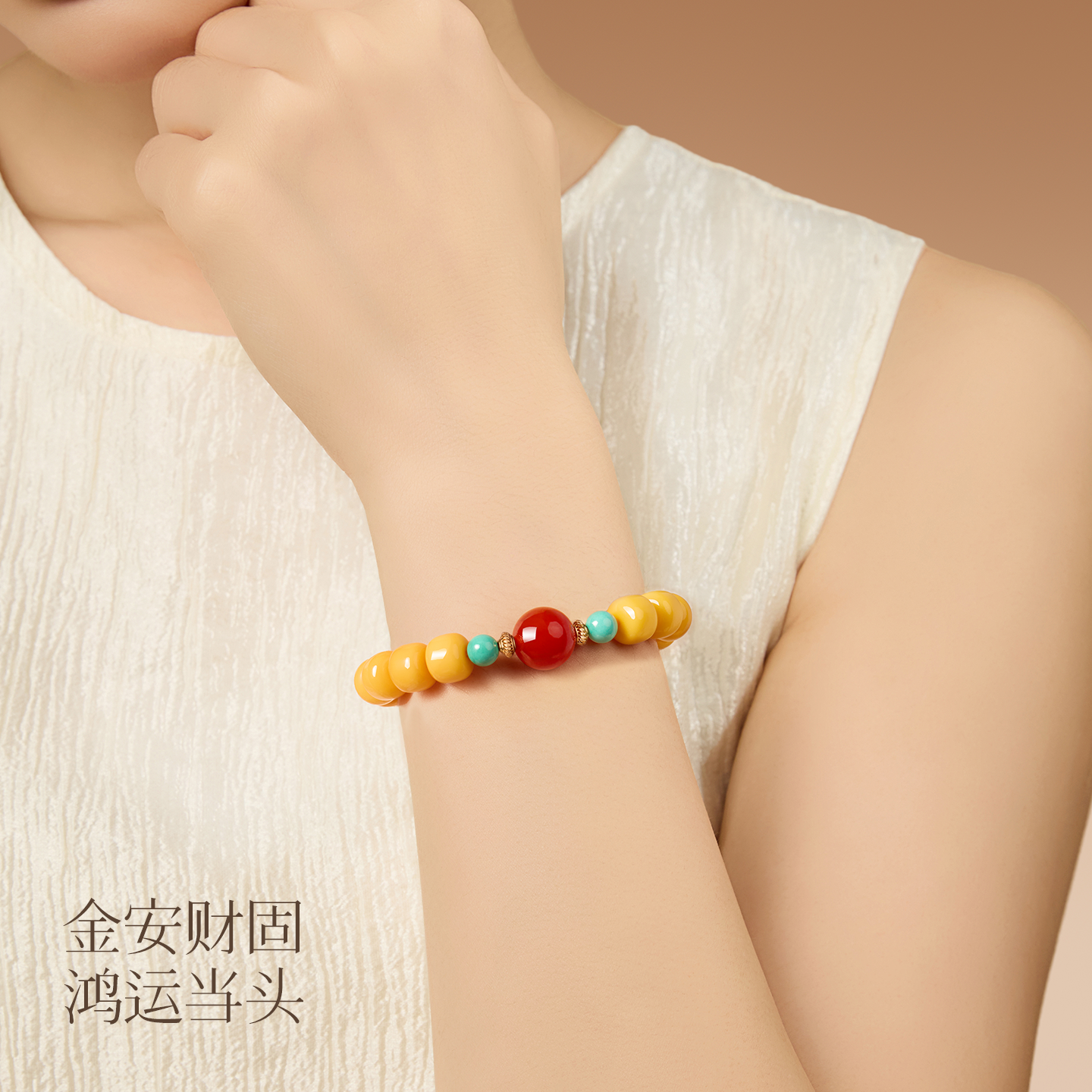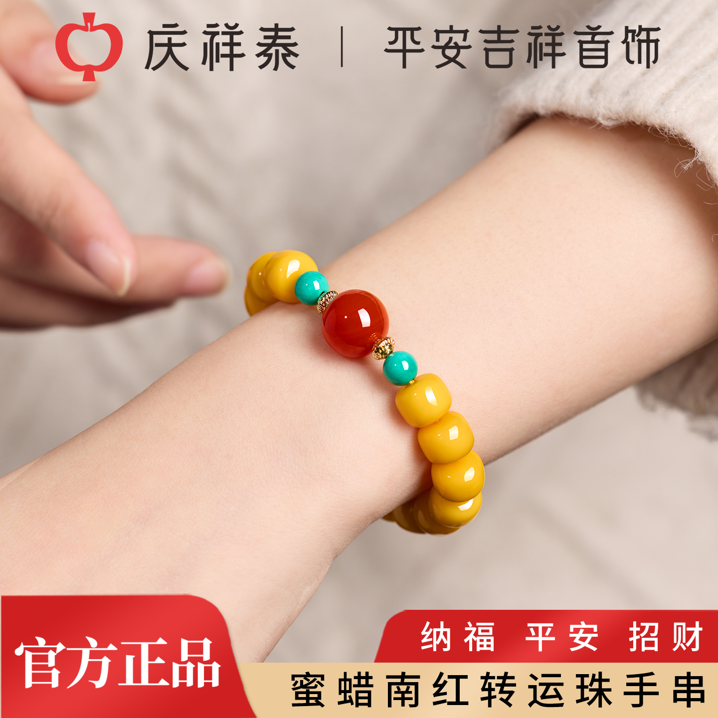 📚 庆祥泰纯天然蜜蜡桶珠手串男士正品官方旗舰店女款鸡油黄南红手链