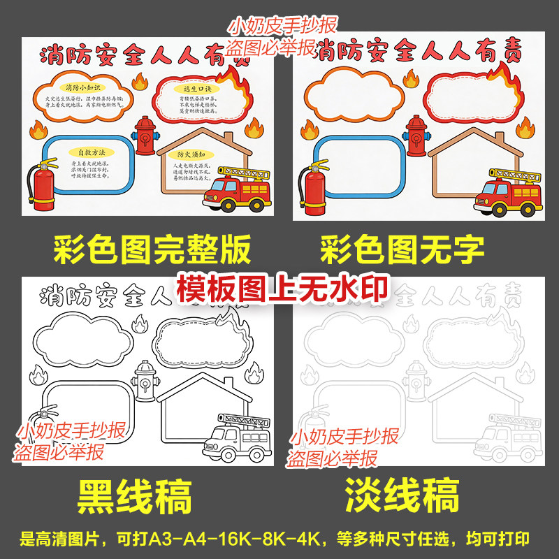 📚 消防安全人人有责手抄报电子版消防知识科谱小报模板黑白线半成品