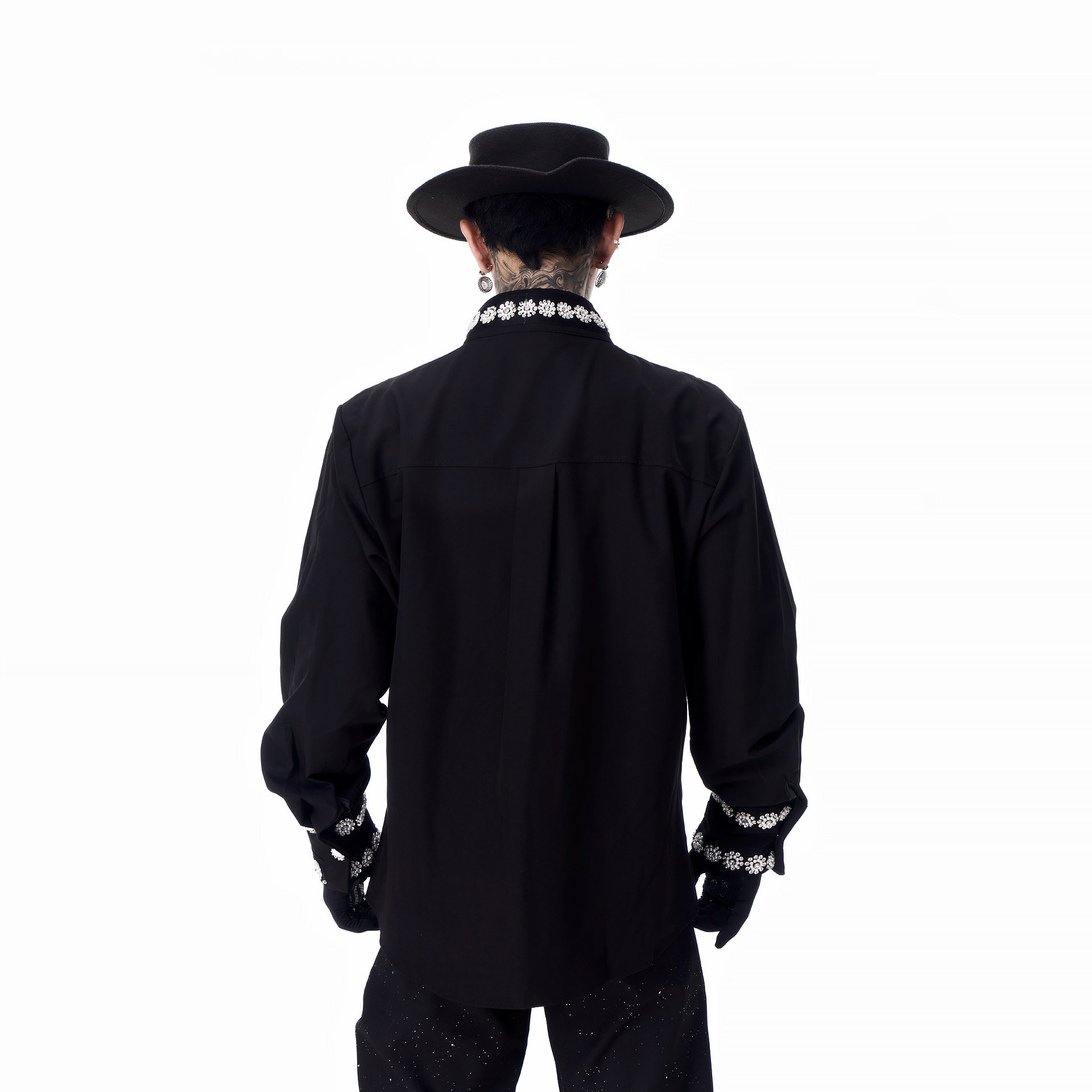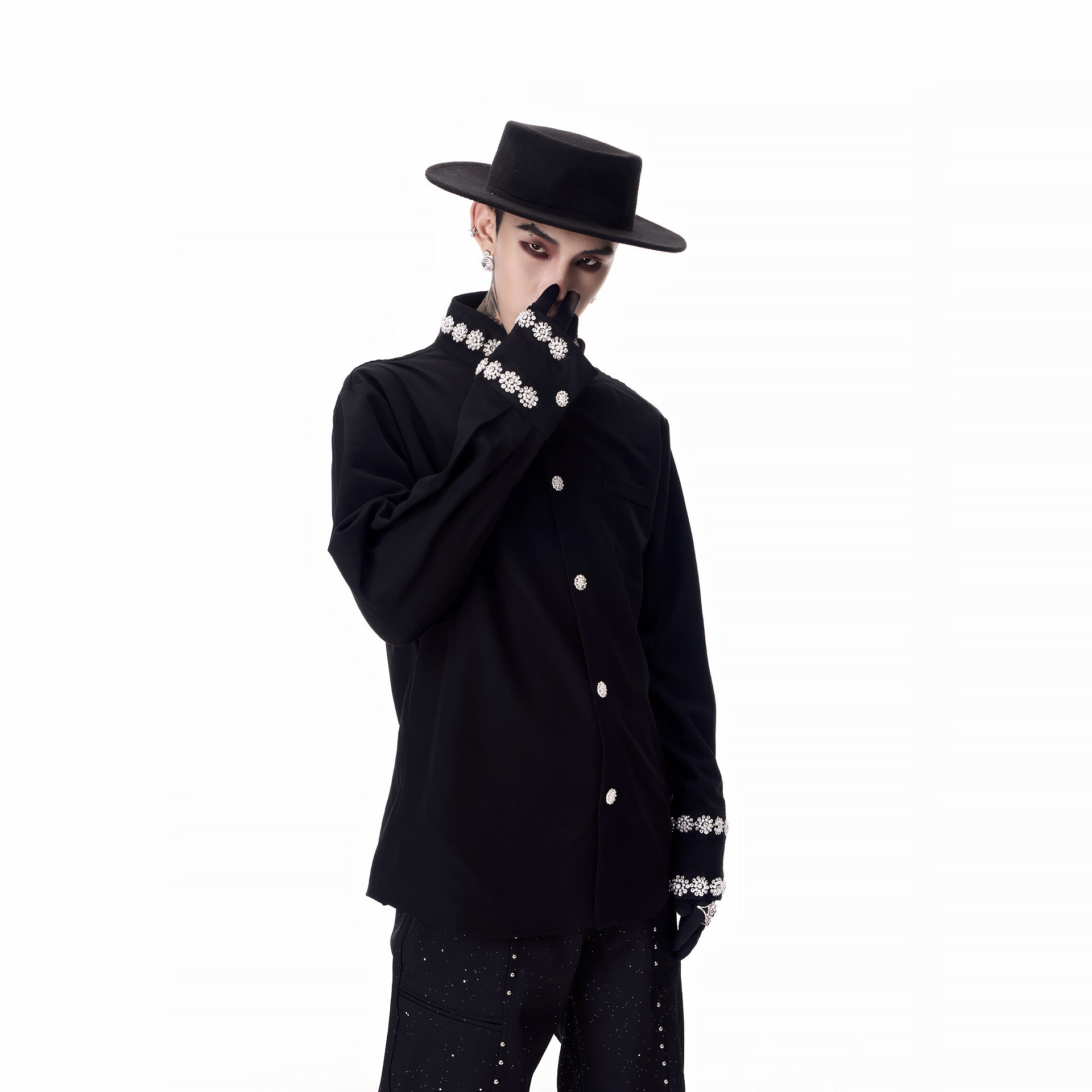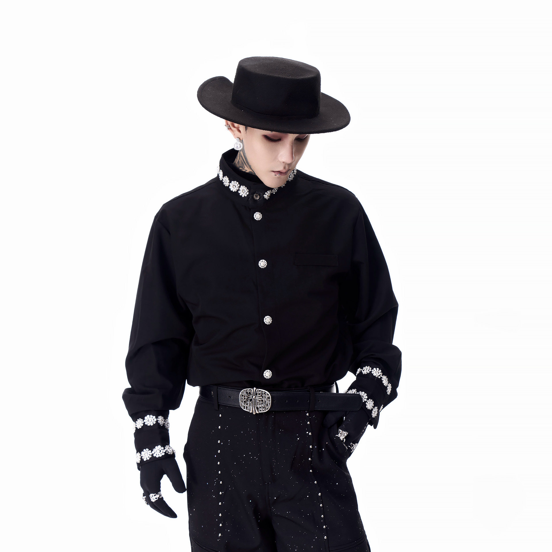 📚 牧羊帅 高定雪花钉珠中式立领垫肩长袖衬衫男模轻奢免烫打底衬衣