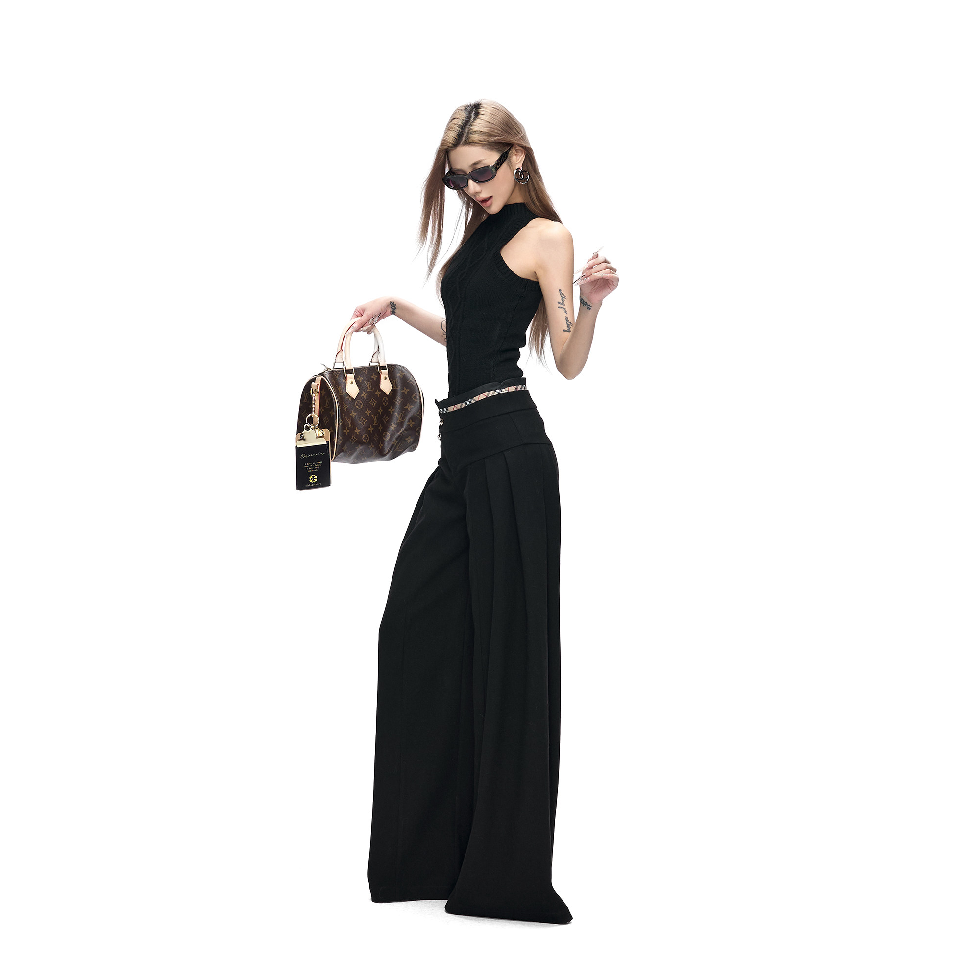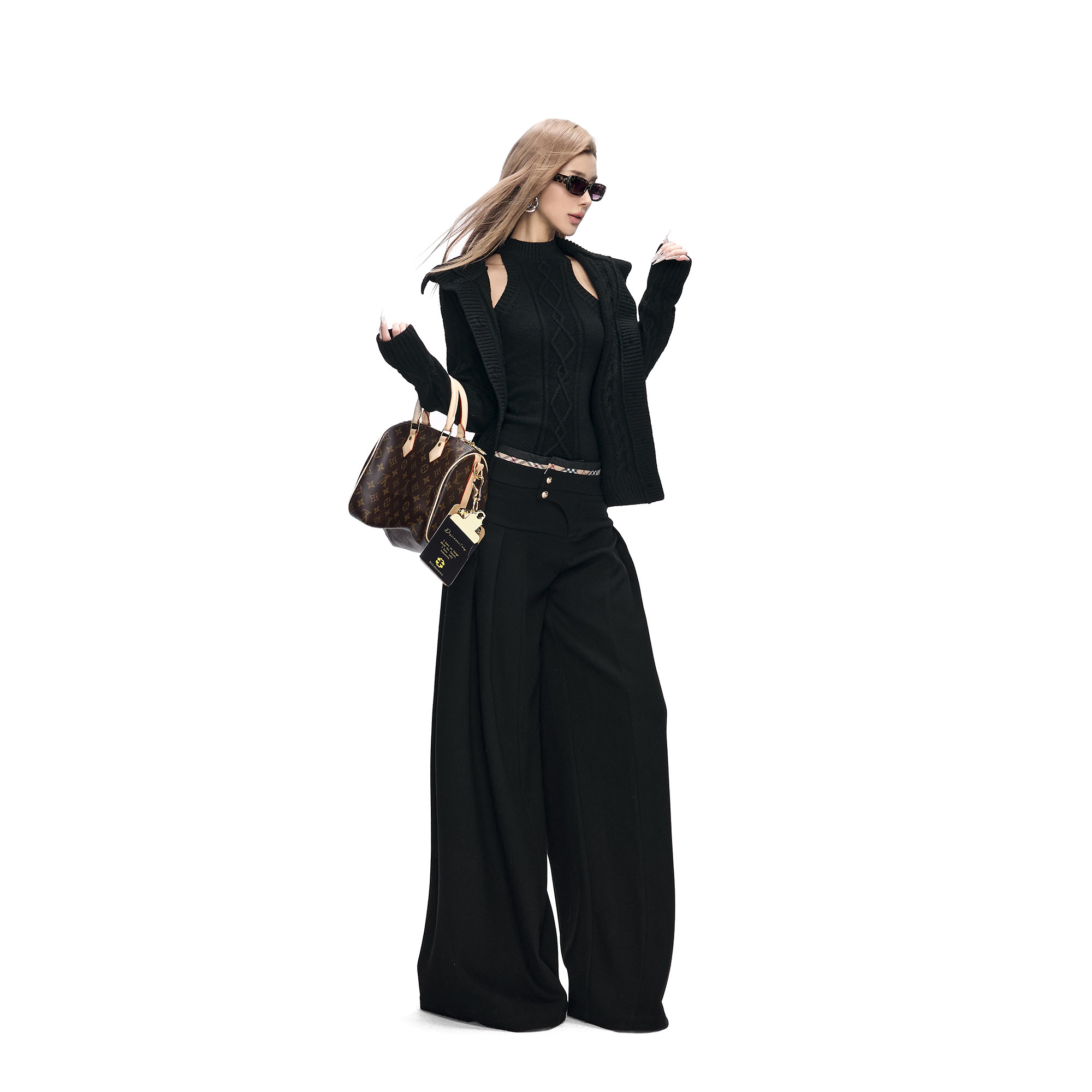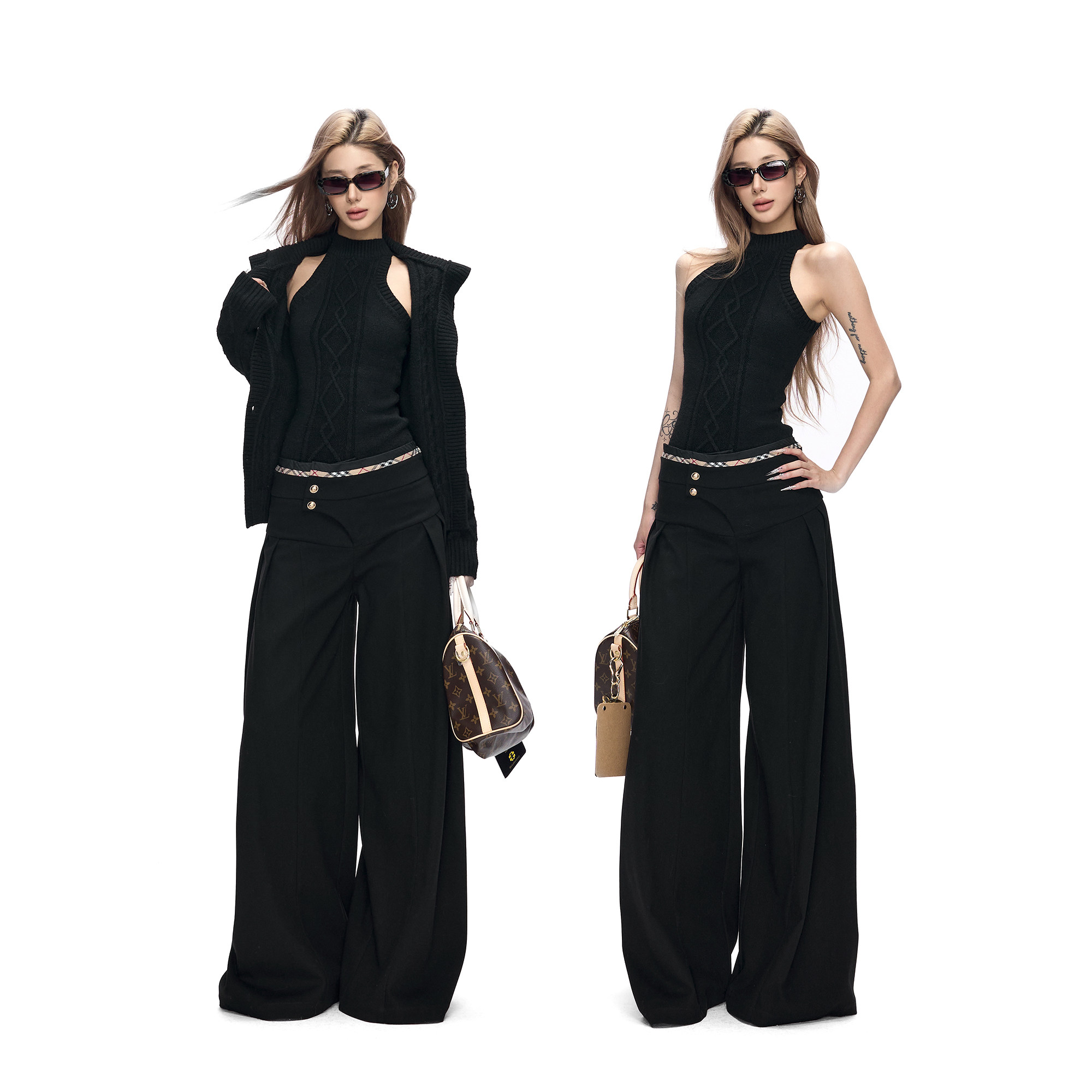 📚 Fanptntox·立体绞花黑色无袖毛衣背心&弹力针织修身高领开衫套装