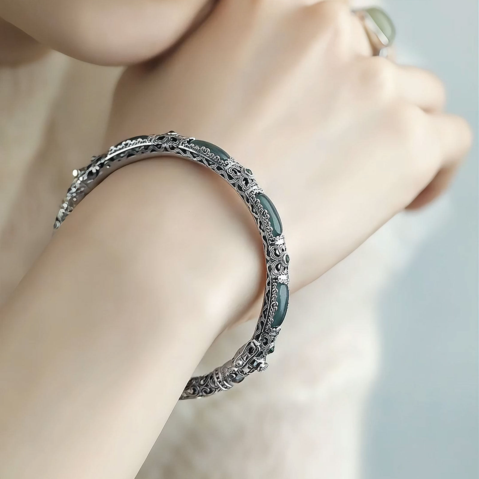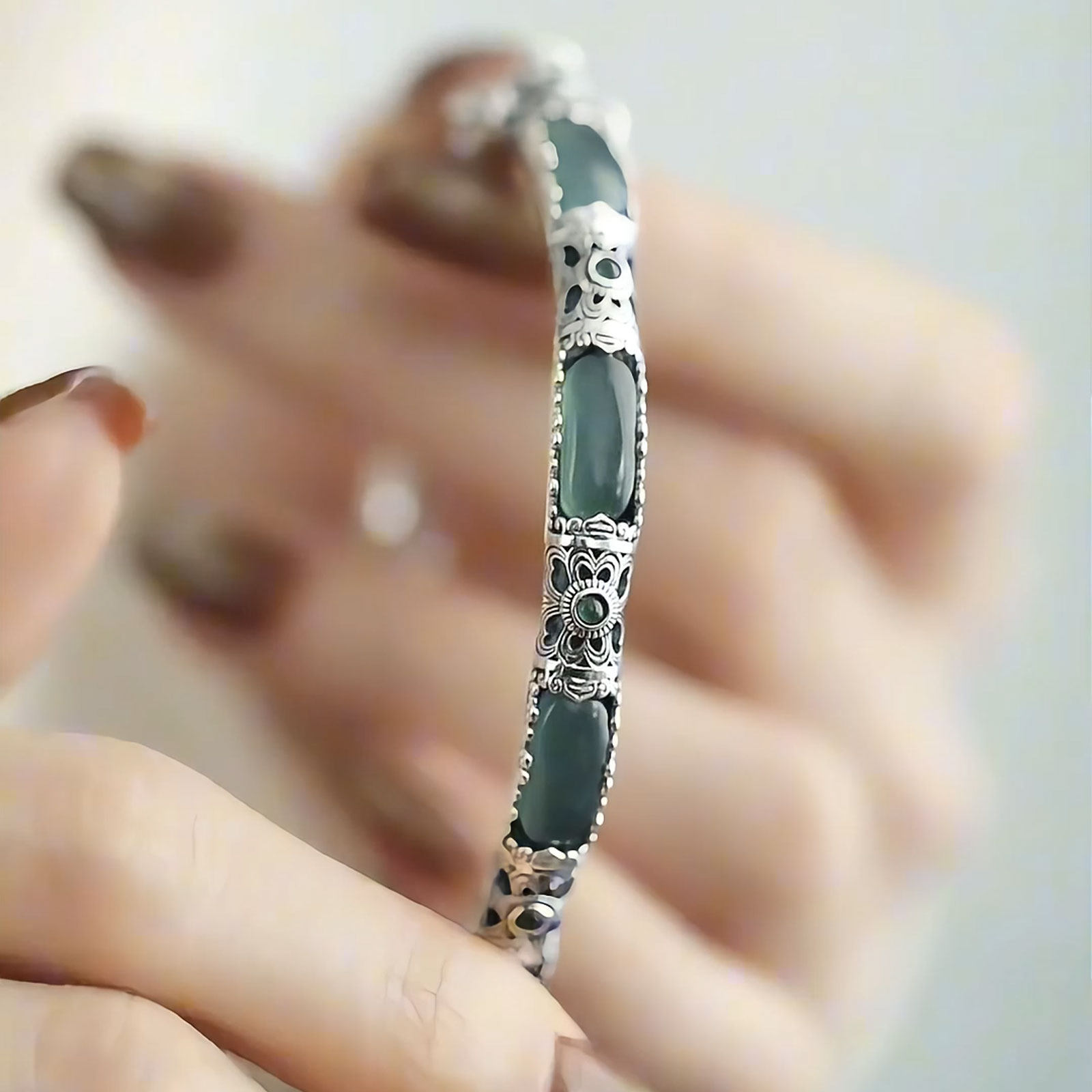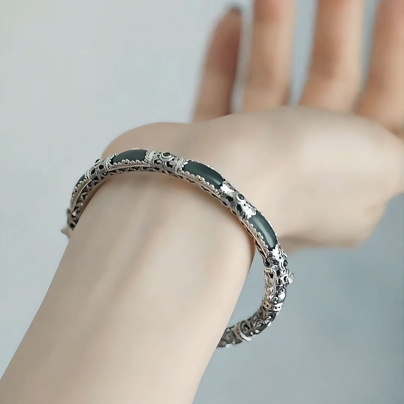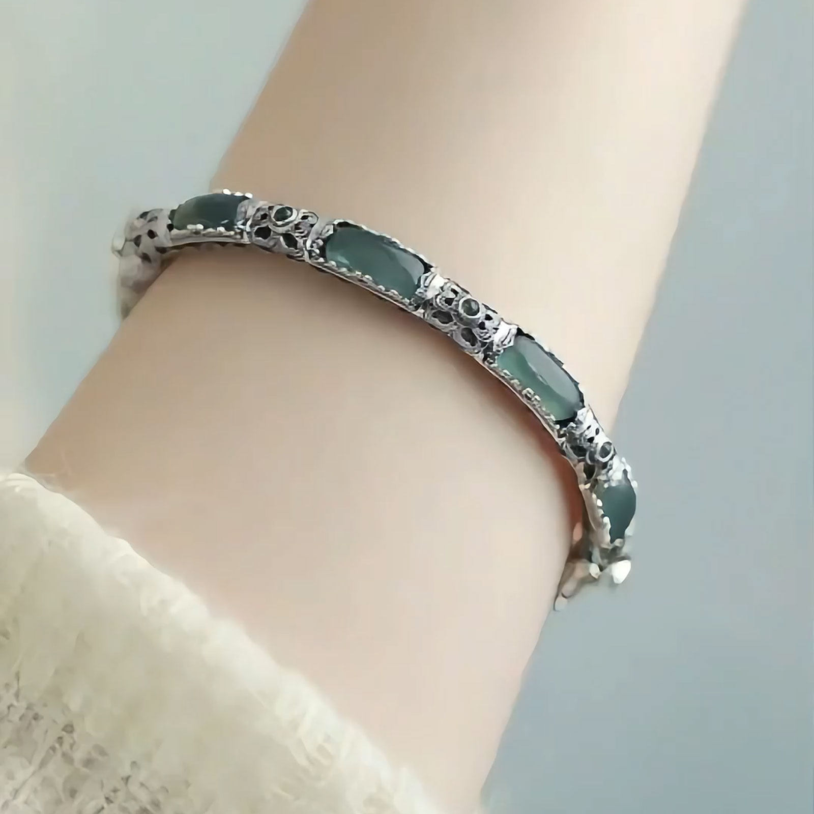 📚 新中式925银明妃蓝水镯镂空竹节花朵卡扣宫廷风手镯女送妈妈礼物