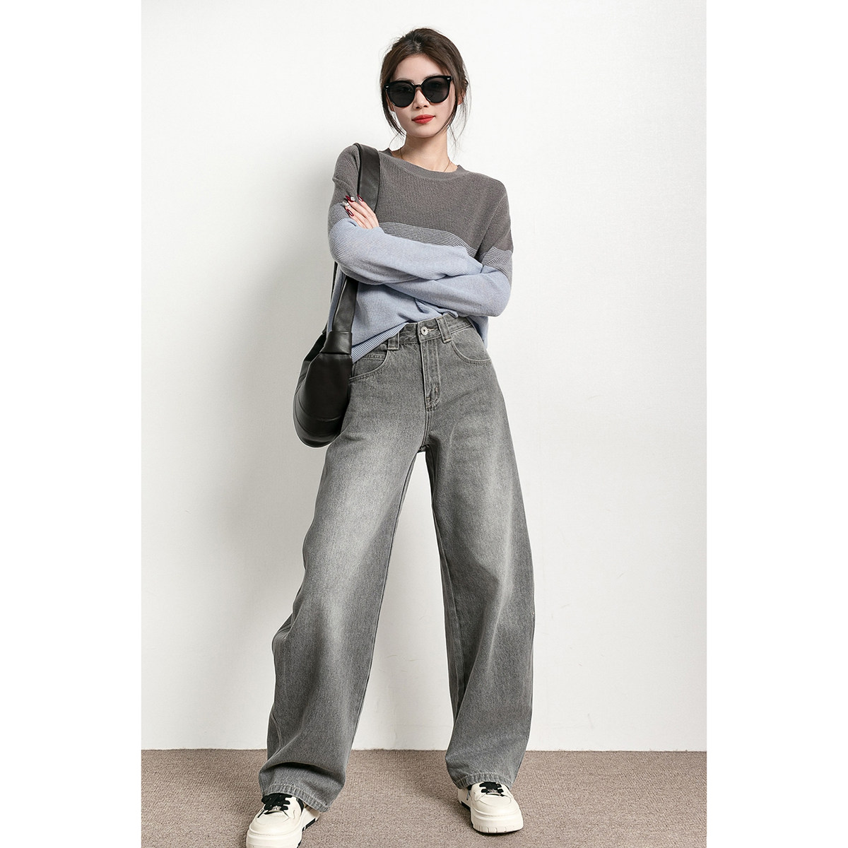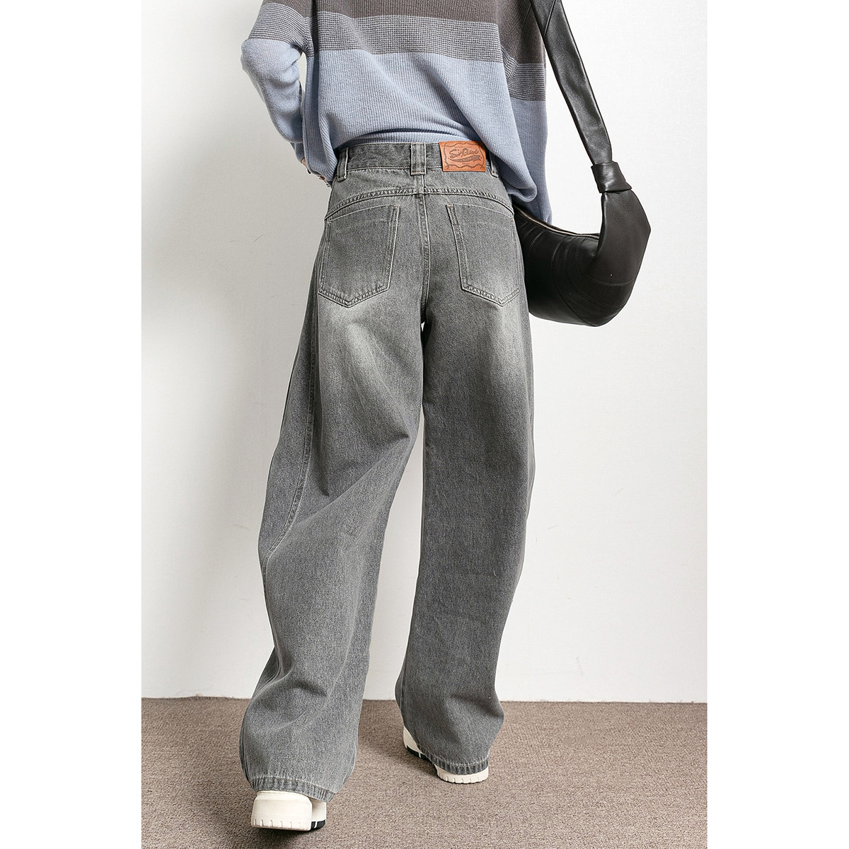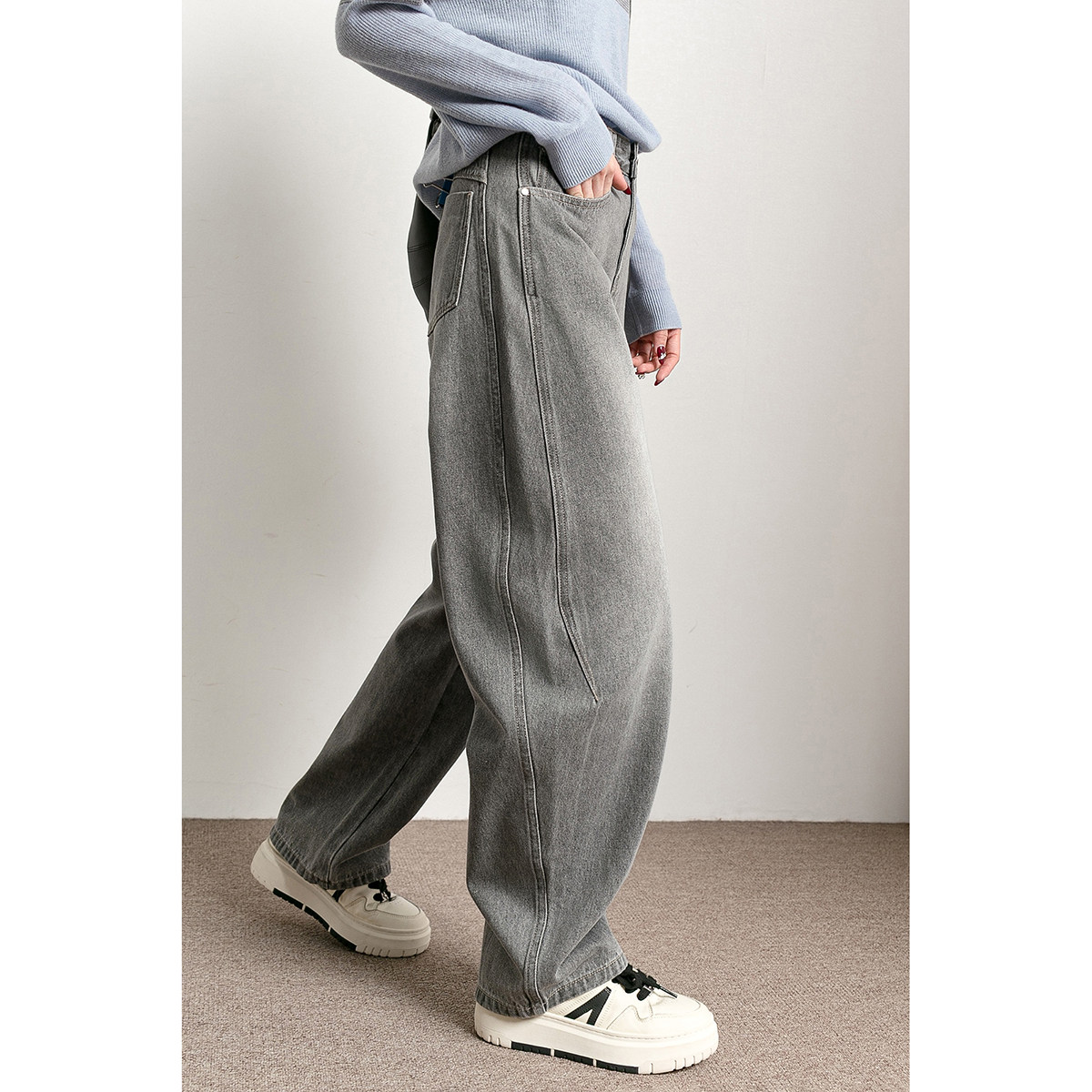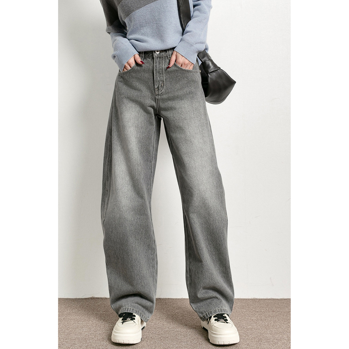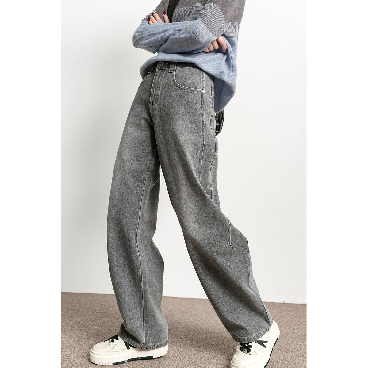 📚 潮葩 遮肉弯刀裤 水洗磨白灰色高腰阔腿牛仔裤女春秋2026新款长裤