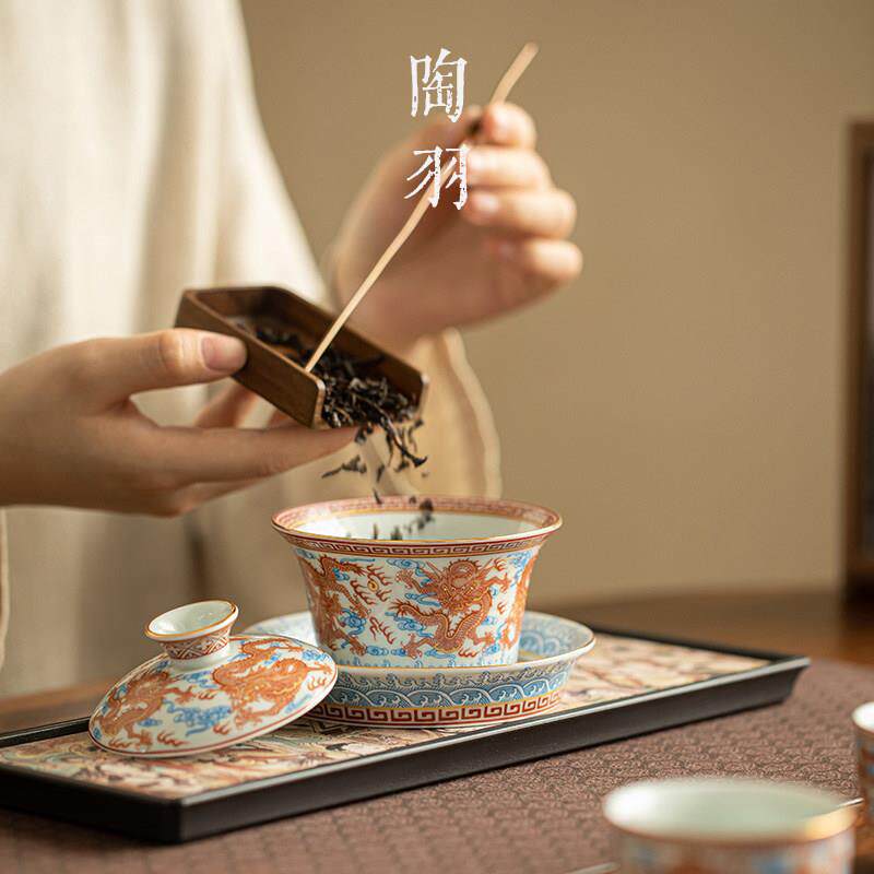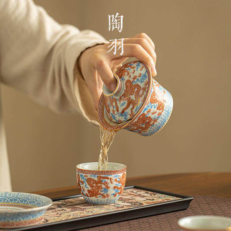 📚 巩红龙纹三才盖碗茶具一壶两杯茶杯茶盘家用陶瓷功夫茶具泡茶器