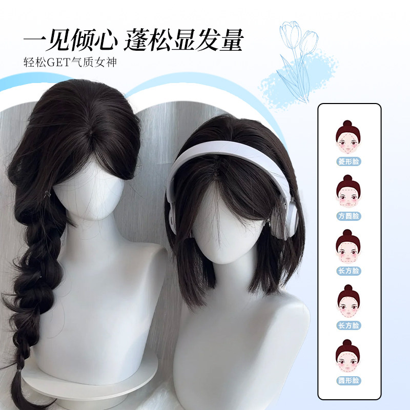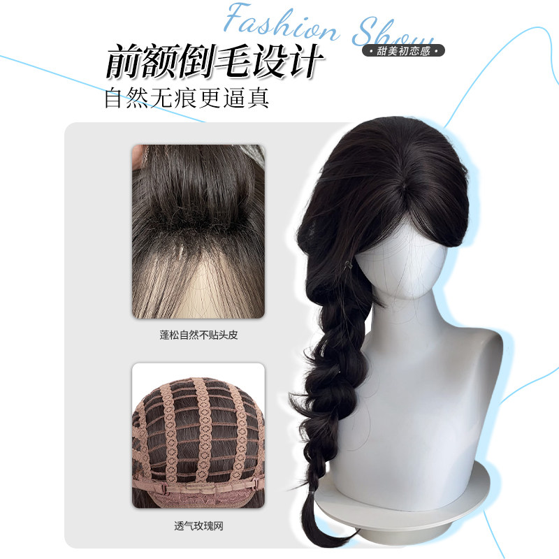 📚 美宿【池塘游余】前额蕾丝中分短发假发女全头套仿真麻花辫长卷发
