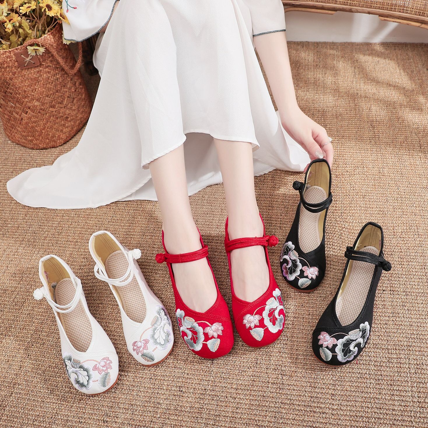📚 新款女绣花鞋单鞋花朵布鞋女士旗袍鞋鞋搭扣白色红色黑色鞋子
