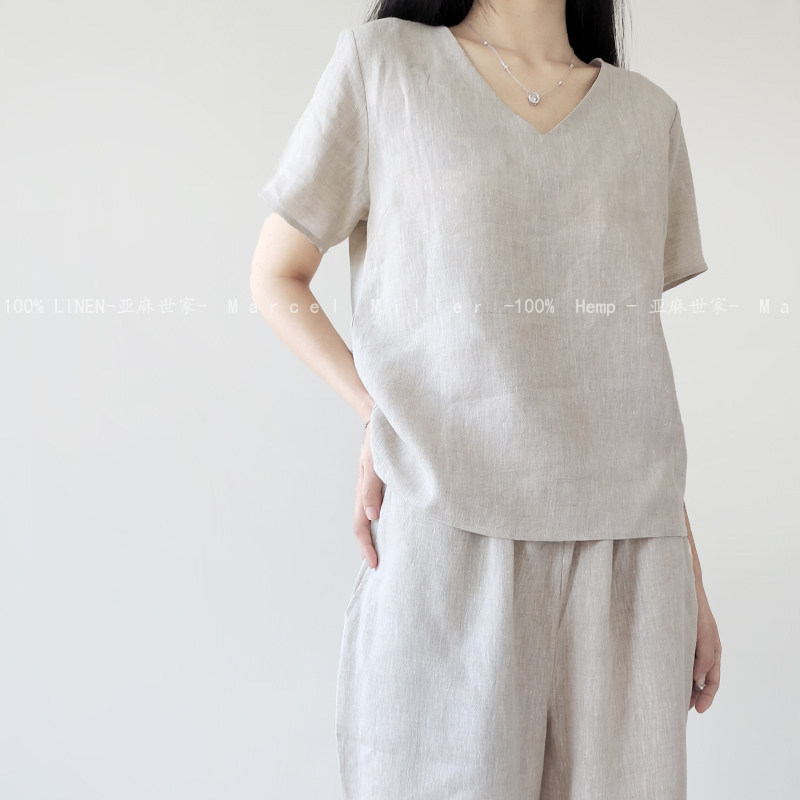 📚 重逢 基础款法国麻极简V领短袖上衣宽松九分裤 纯色亚麻凉爽轻盈