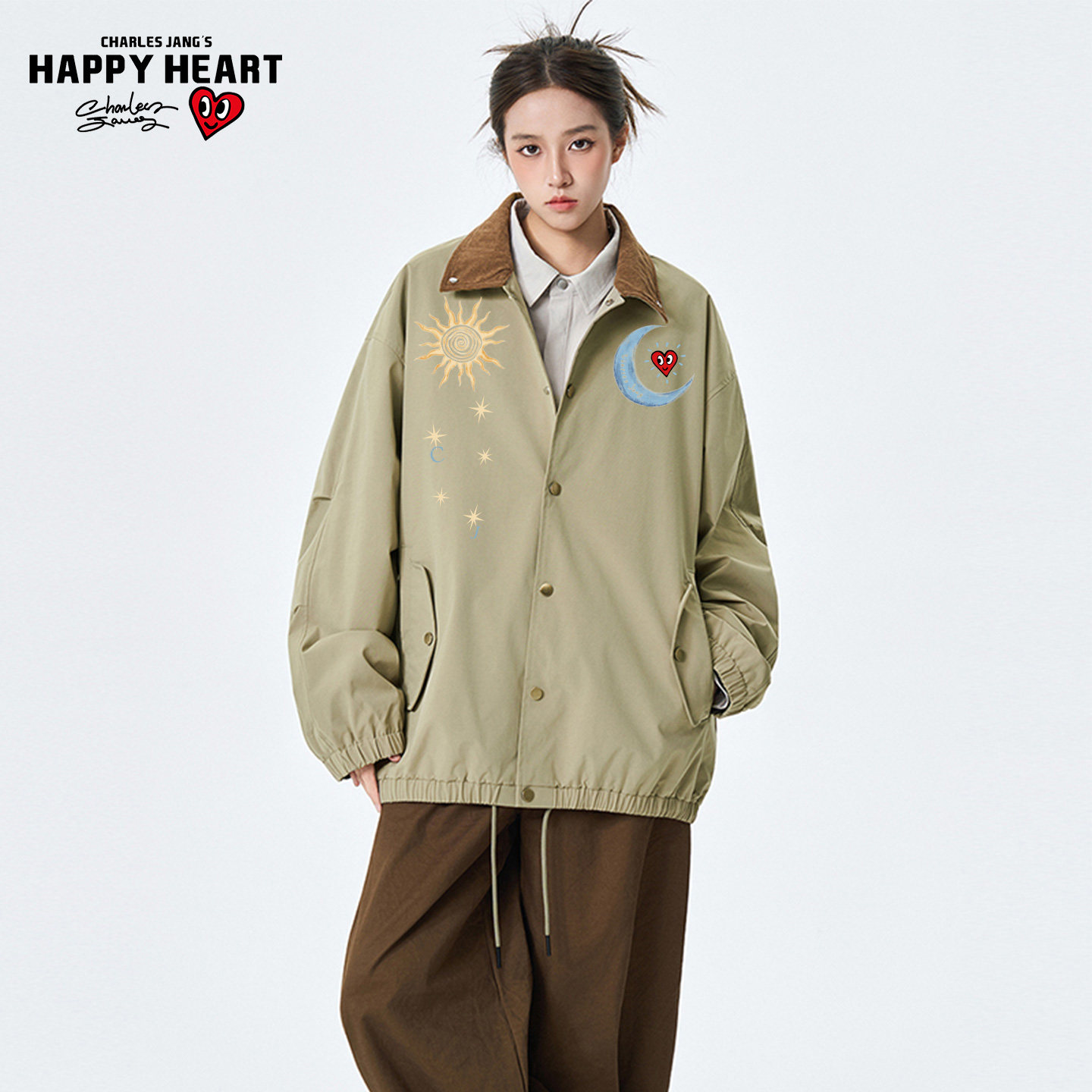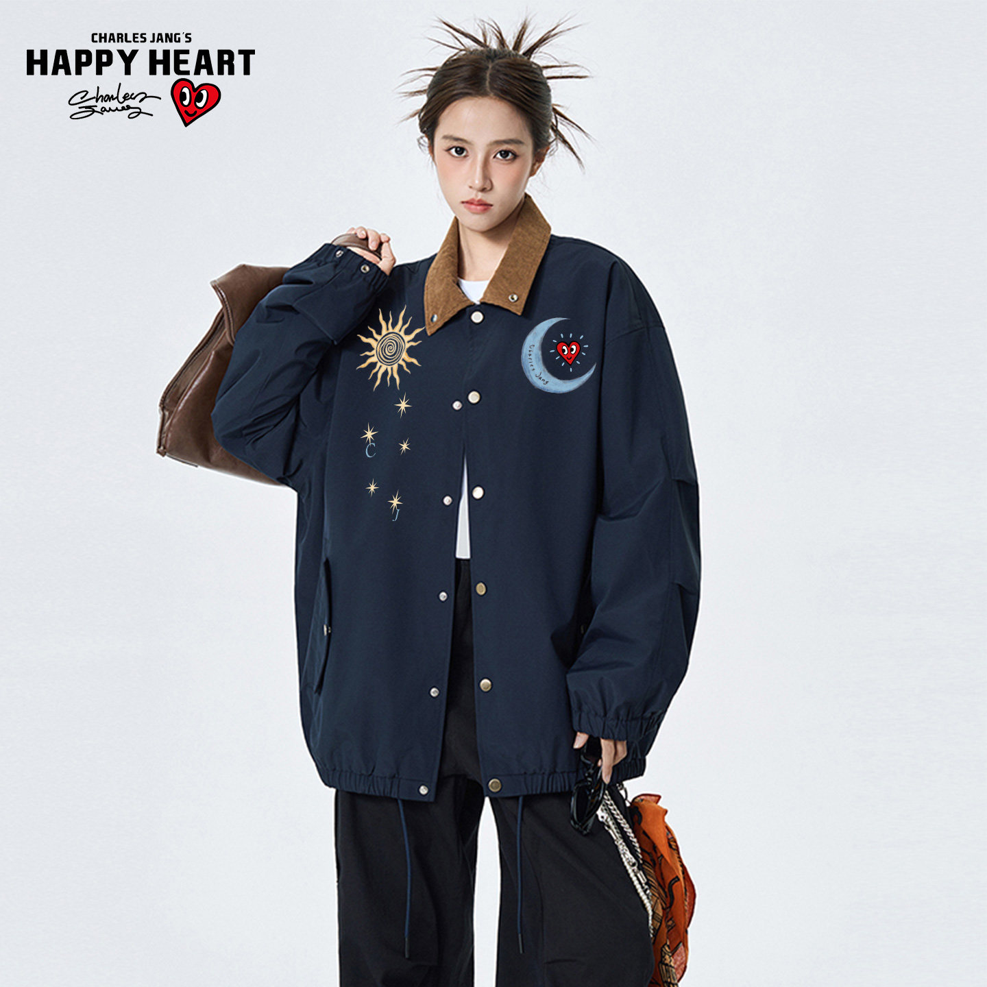 📚 查尔斯桃心美式格纹翻领夹克男春秋季新款日月印花情侣教练服外套