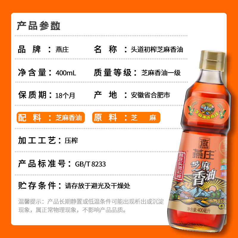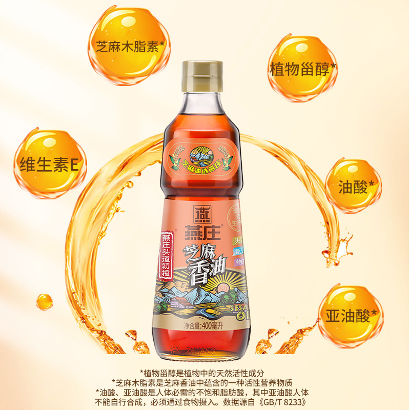 📚 燕庄头道初榨芝麻香油400ml*1瓶调味油家用凉拌菜食用油物理压榨