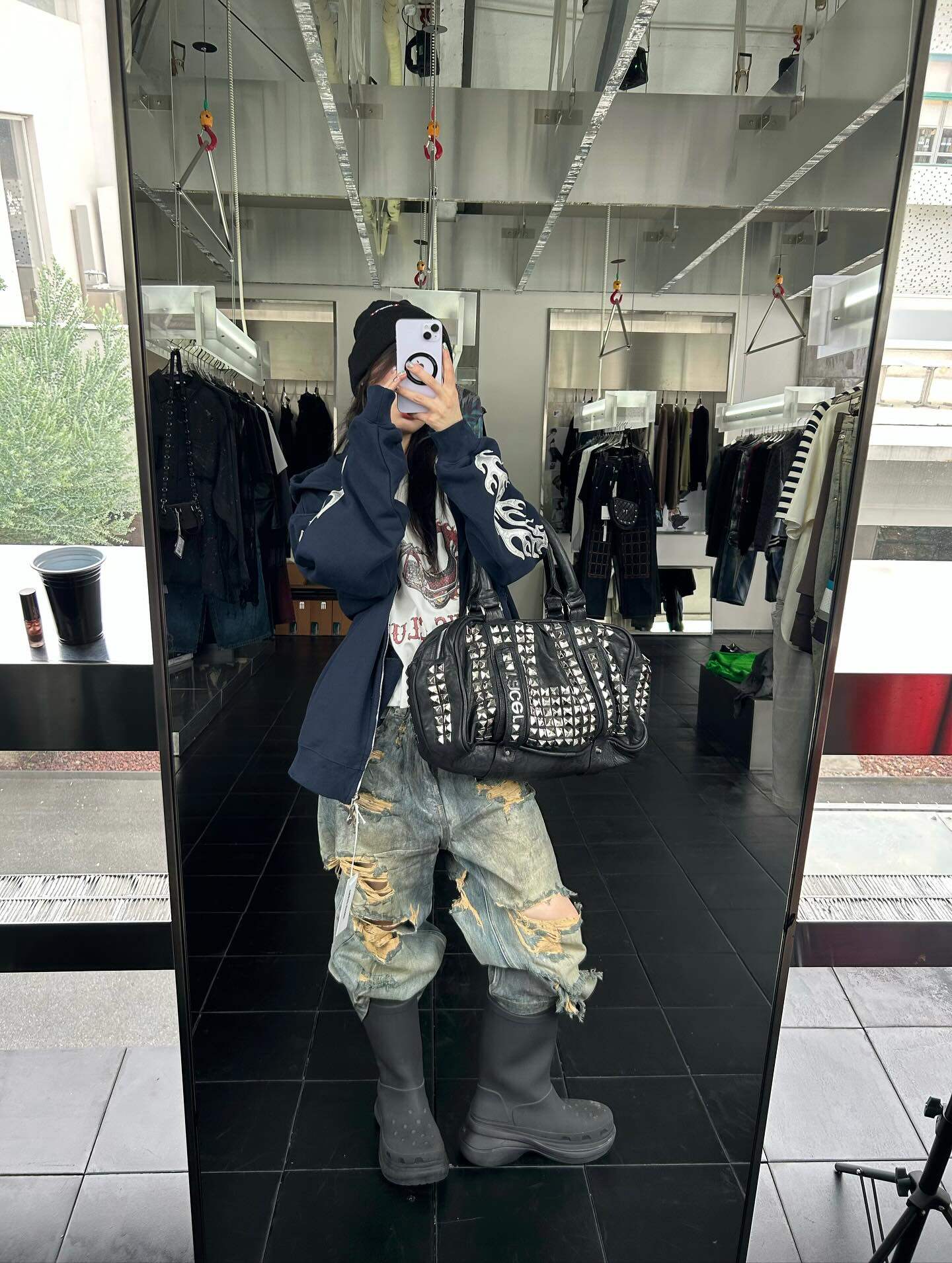 📚 Thug club小众金属星月logo做旧破坏刺绣火焰拉链外套美式连帽衫