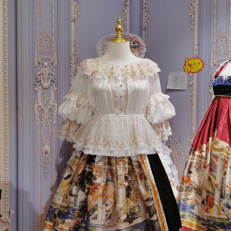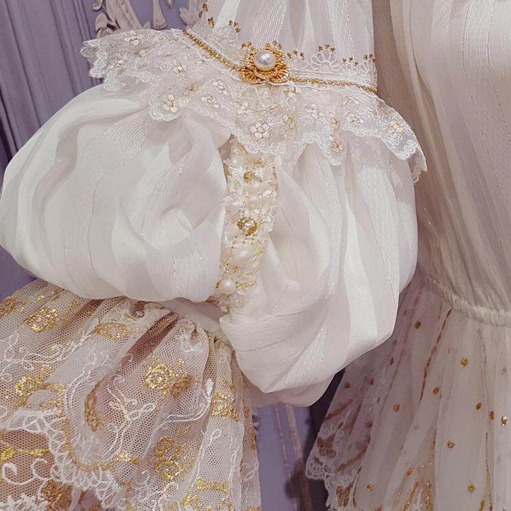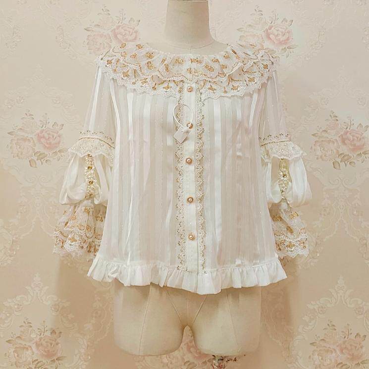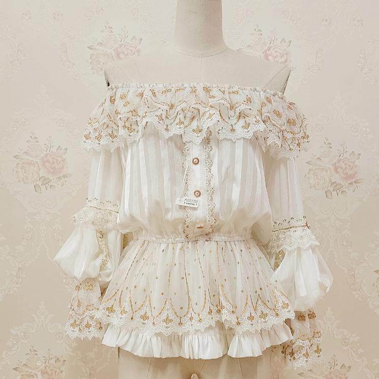📚 加冕衬衫 条纹雪纺一字肩收腰灯笼袖宫廷复古华丽衬衫