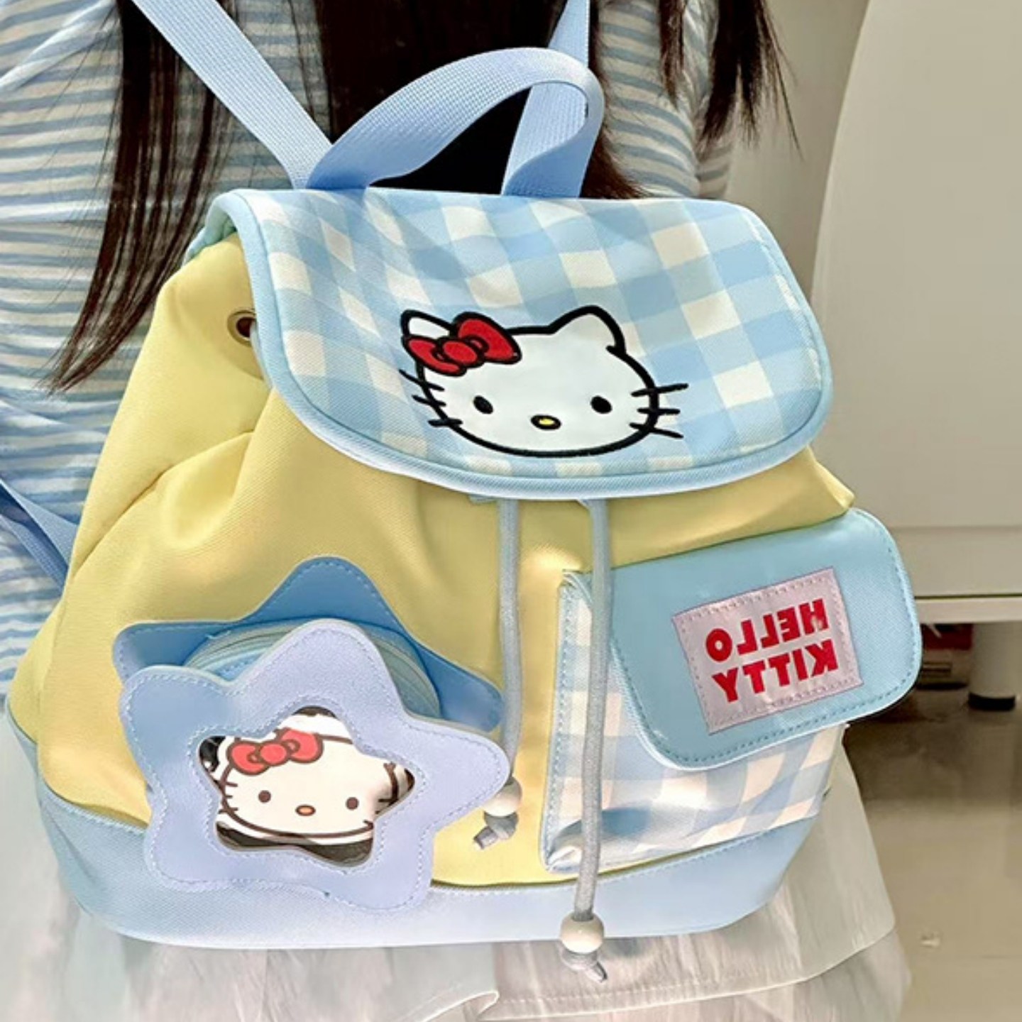 📚 2025新款ins风可爱格子抽绳手提包kt猫小书包学院双肩包百搭背包