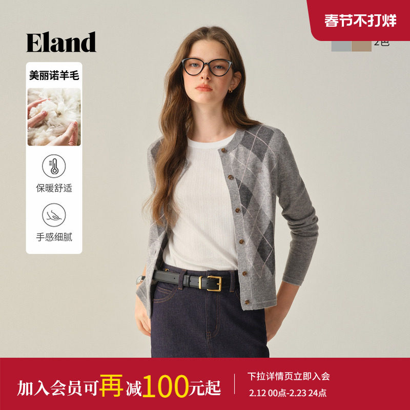 📚 【美丽诺羊毛】Eland衣恋毛针织衫女时尚菱格毛衣2025冬季新款