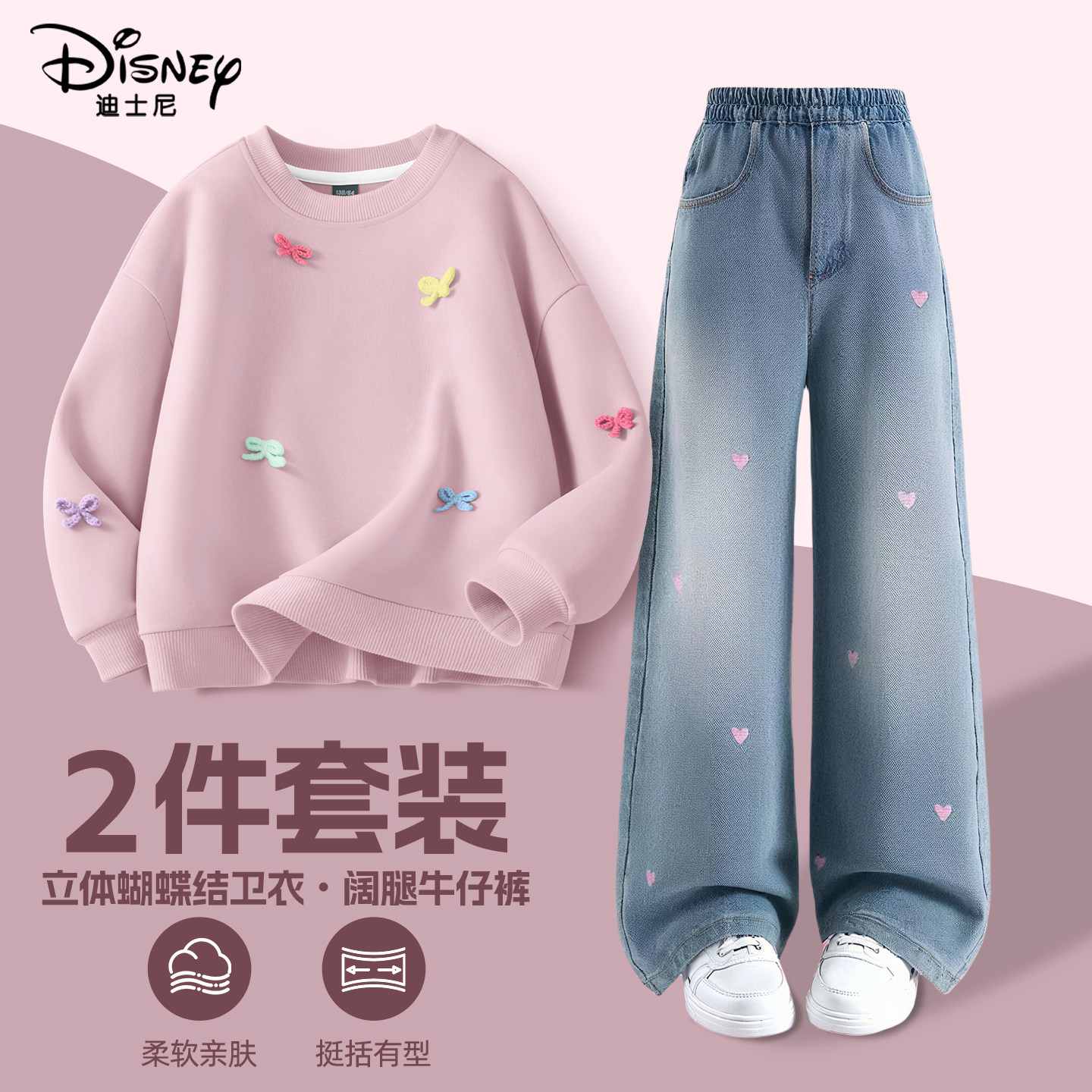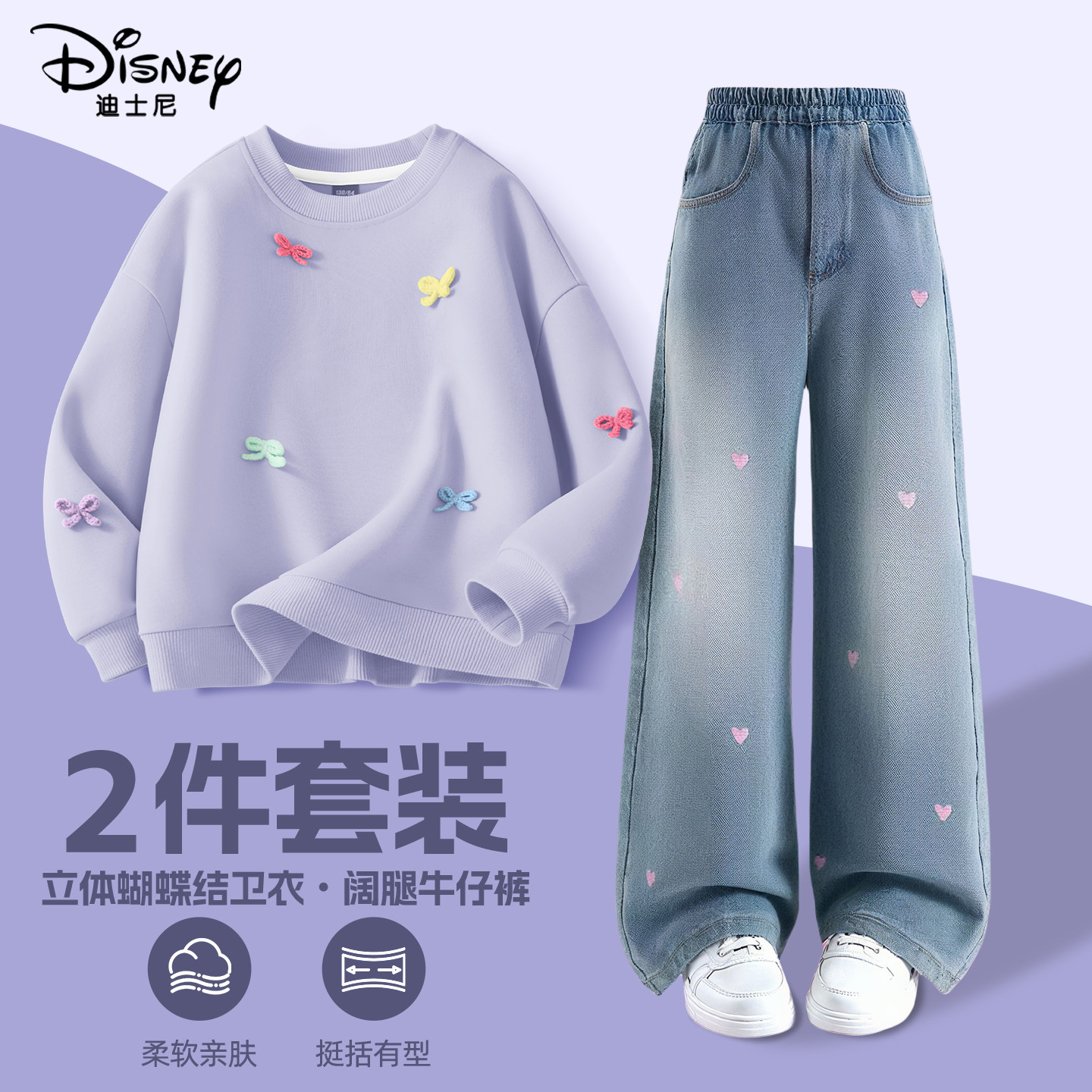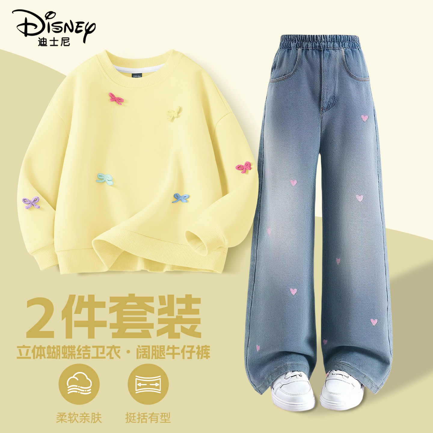 📚 迪士尼女童春秋卫衣2025新款洋气儿童假两件长袖牛仔裤套装时尚潮