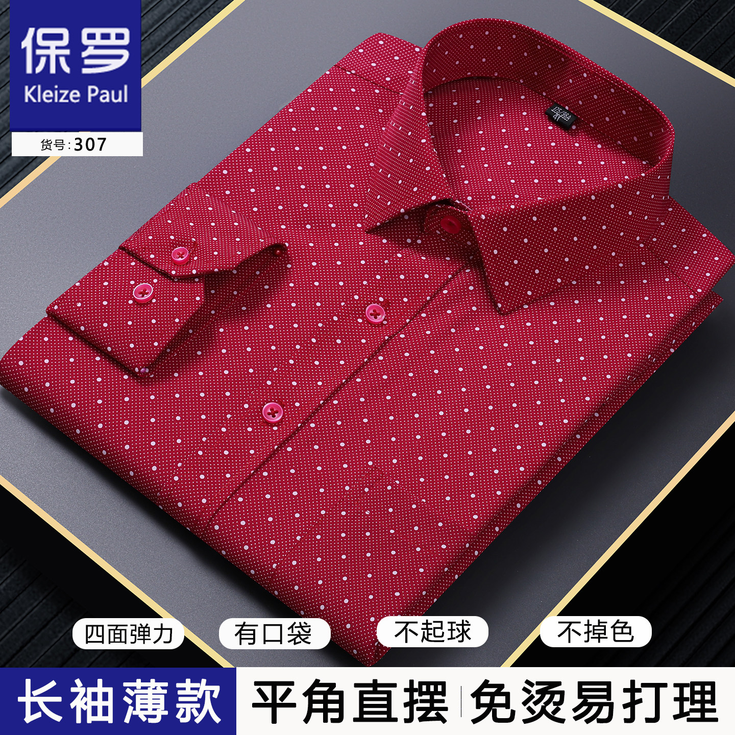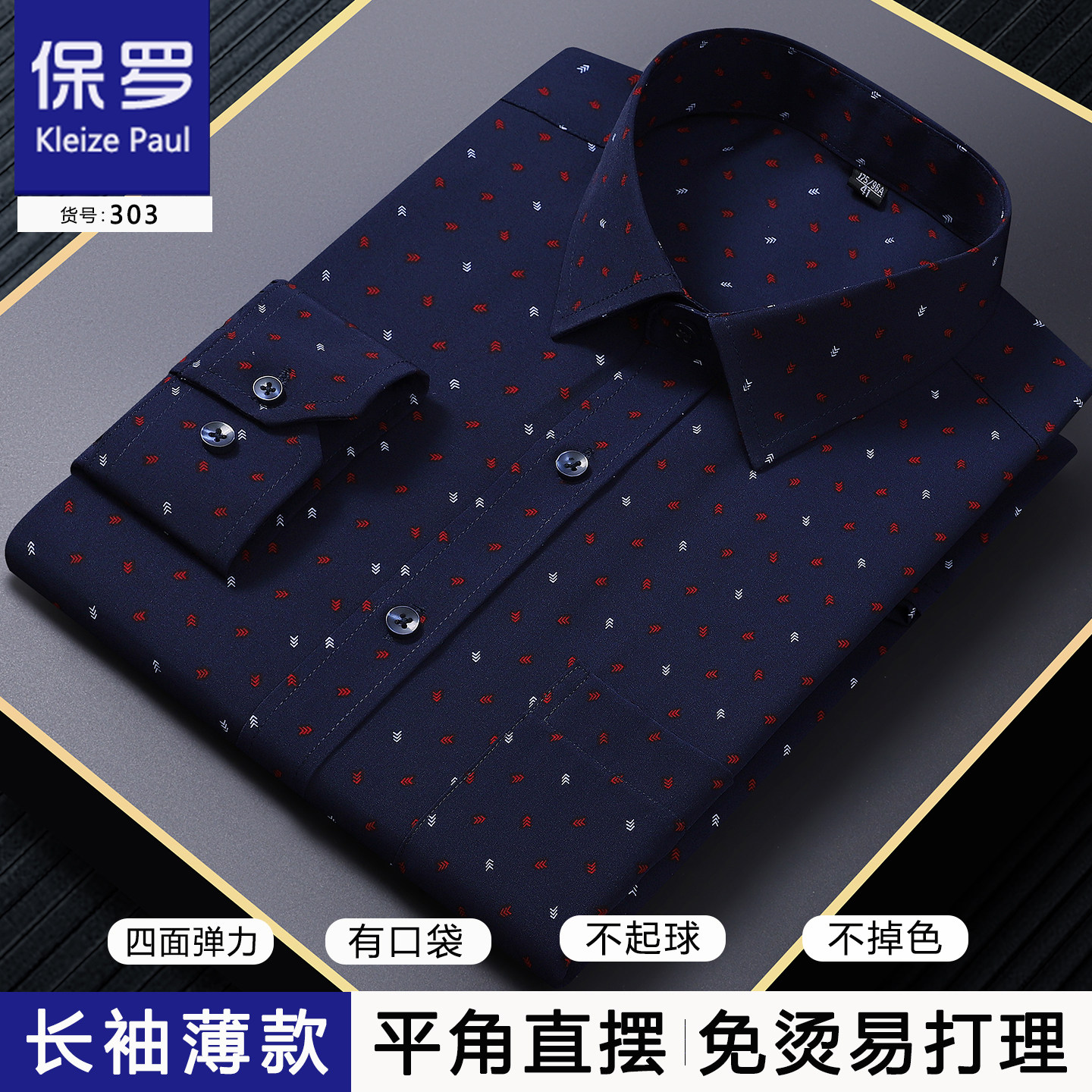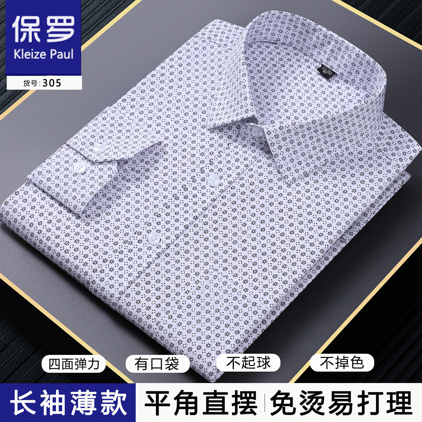 📚 保罗新款男士免烫印花长袖衬衫中老年人爸爸弹力休闲薄款碎花衬衣