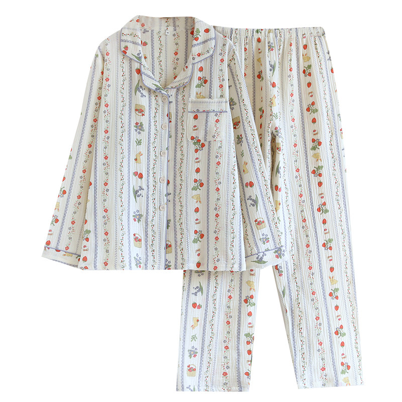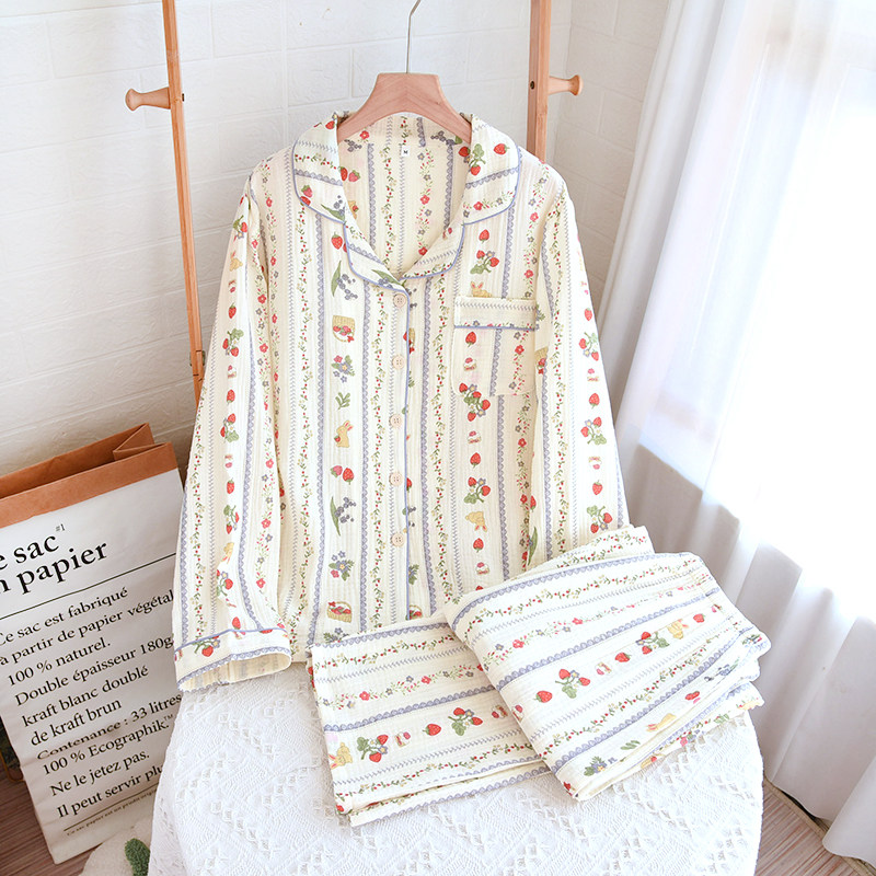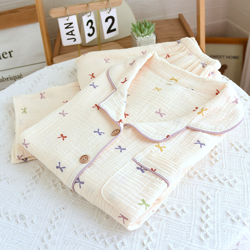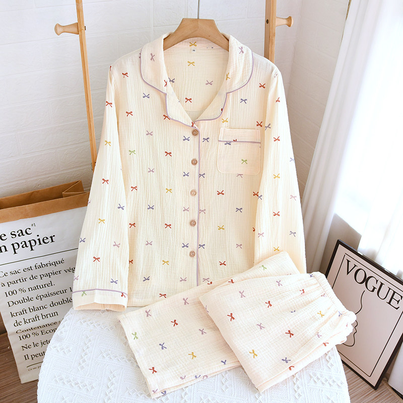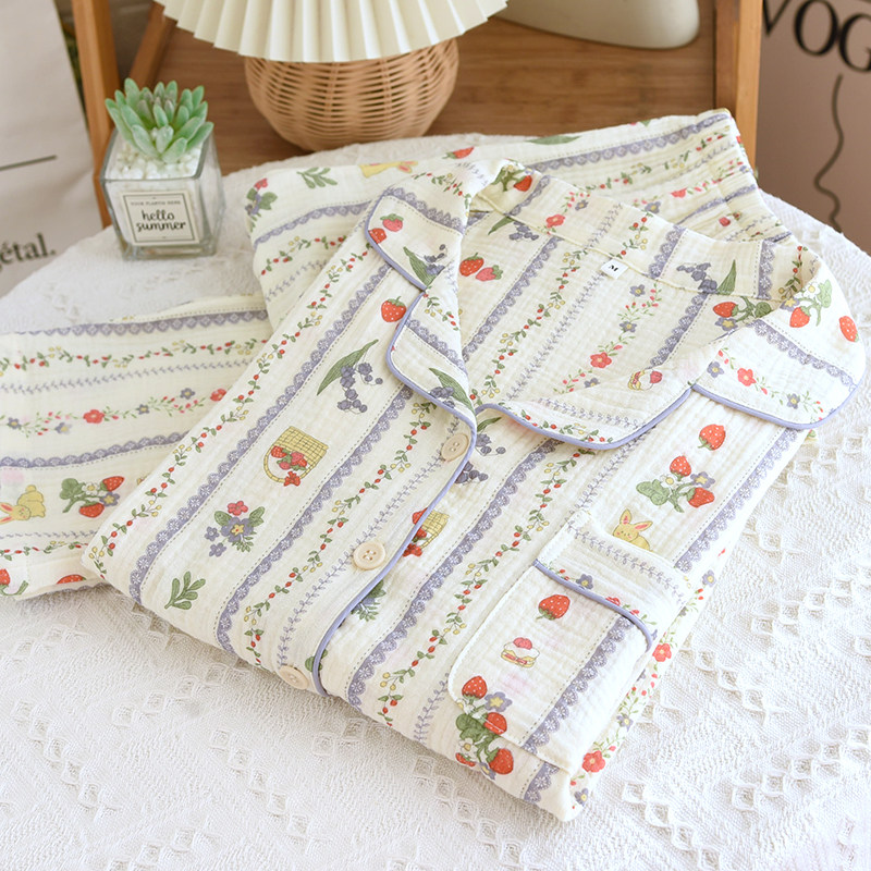 📚 出口睡衣女款全棉麻双层纱布长袖春秋夏季长袖长裤直筒印花家居服