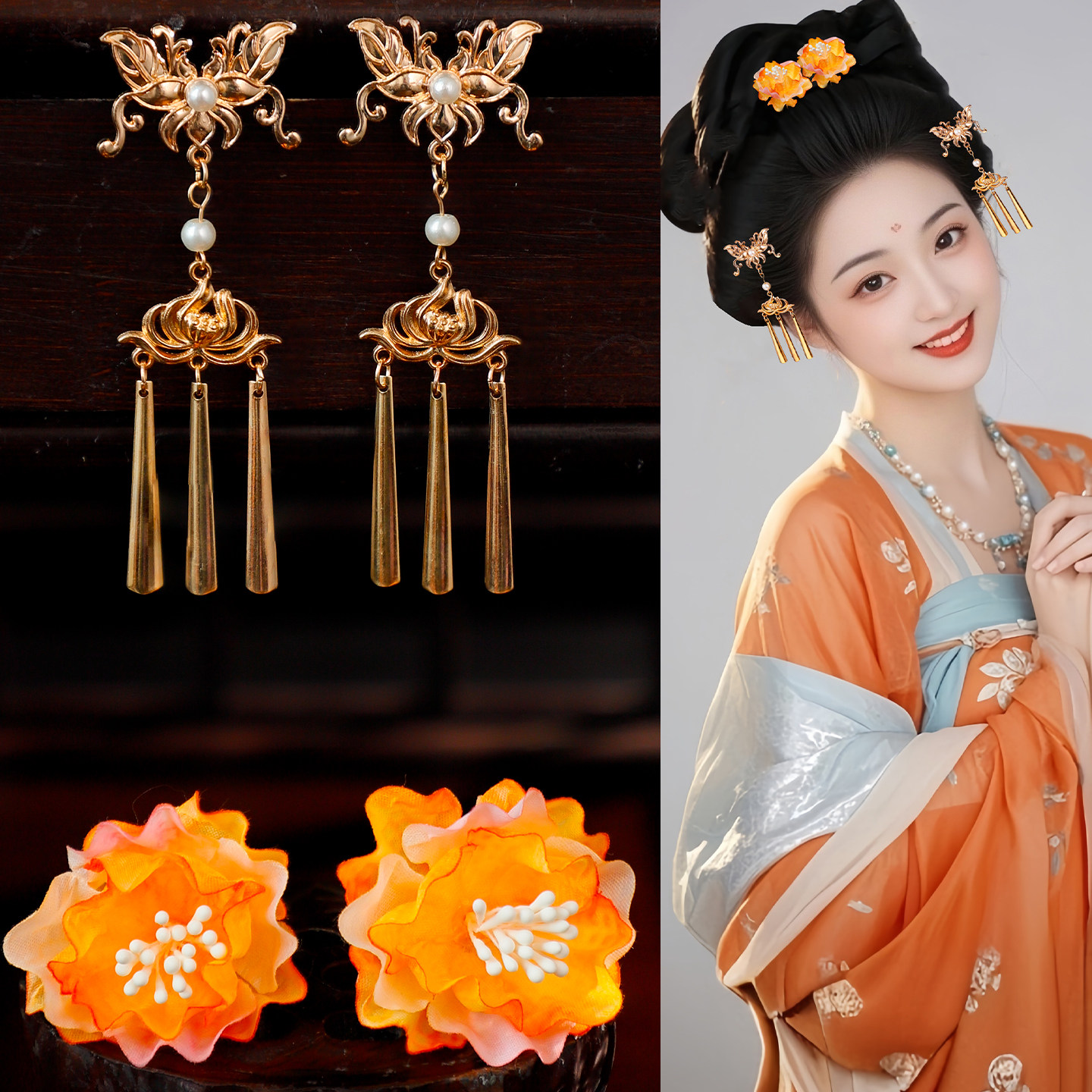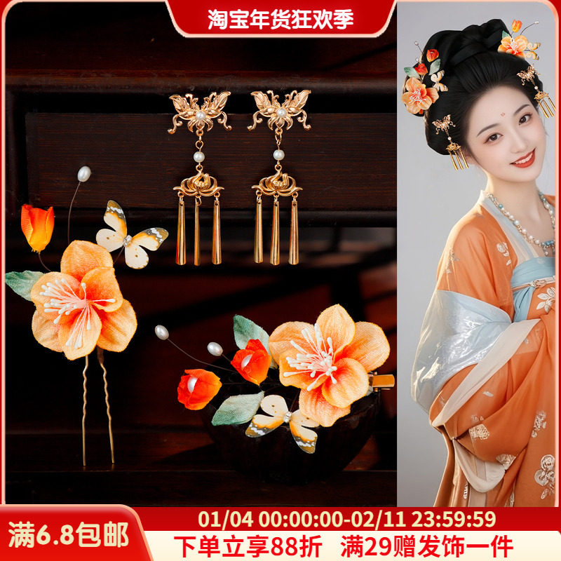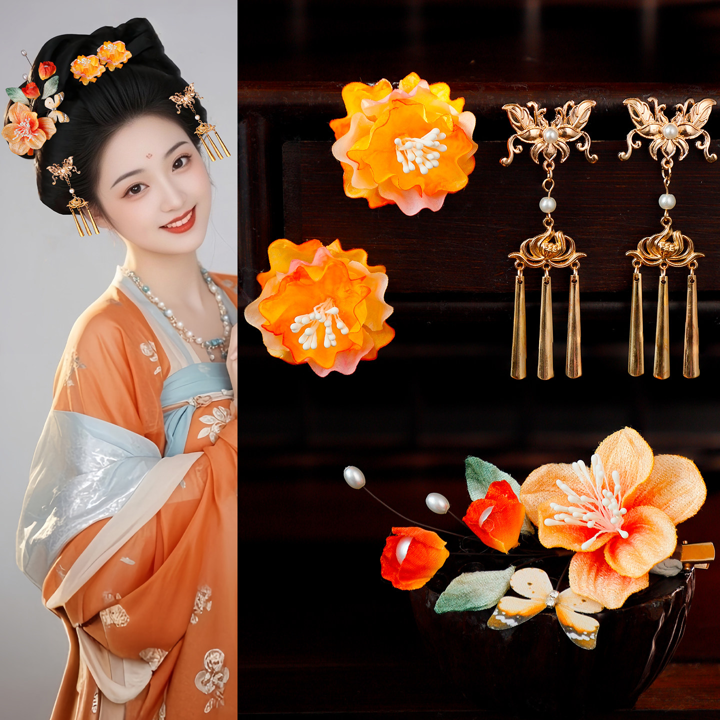 📚 古风唐风汉服发饰掩鬓组合套装橘色仿绒花朵发夹流苏u钗点缀配饰