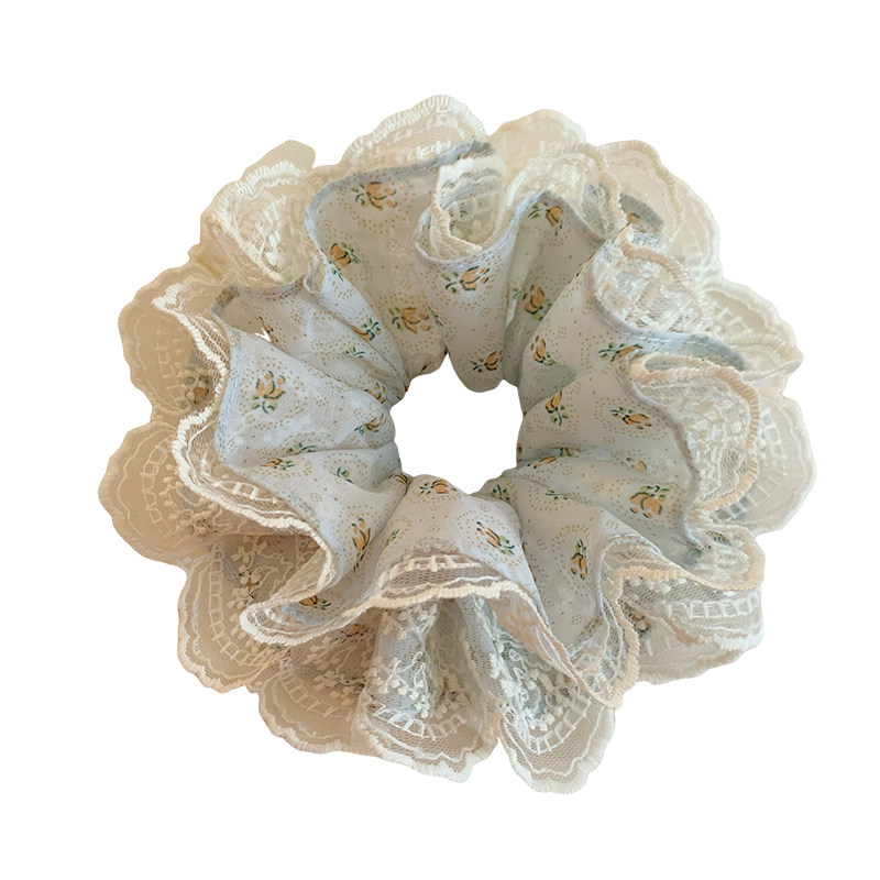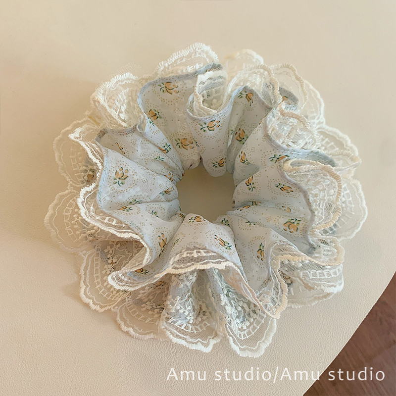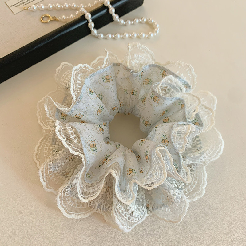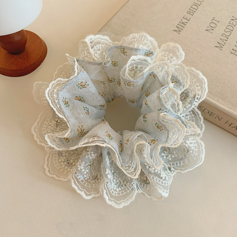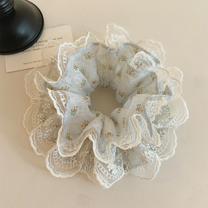📚 浅蓝色碎花蕾丝双层大肠发圈女甜美扎头发丸子头发绳侧低马尾头绳