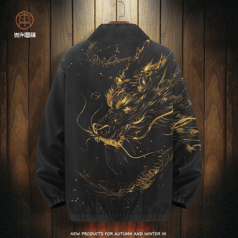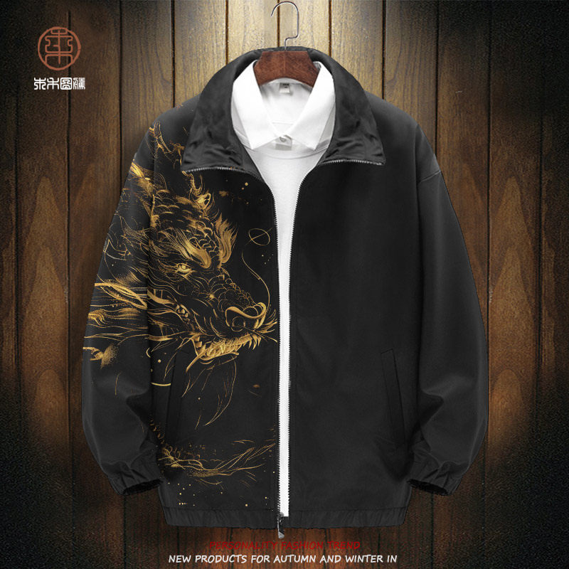 📚 秋冬季潮牌龙图案连帽夹克外套男士大码开衫茄克古风青年运动上衣