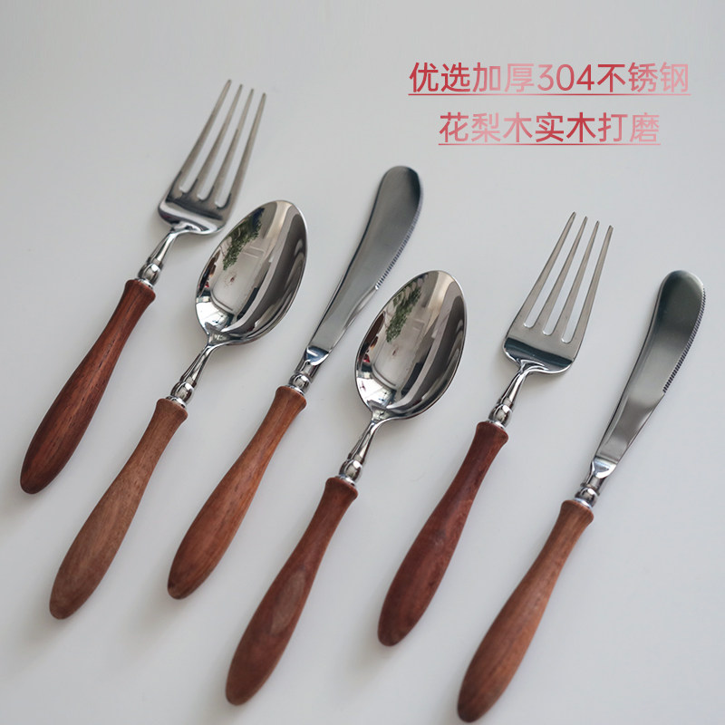 📚 法式复古不锈钢西餐刀叉套装牛排刀叉勺子甜品勺实木柄高颜值餐具