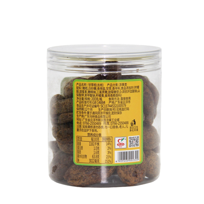 📚 马林食品甘草榄200g×1瓶(去核)橄榄干蜜饯果脯甘草榄休闲零食