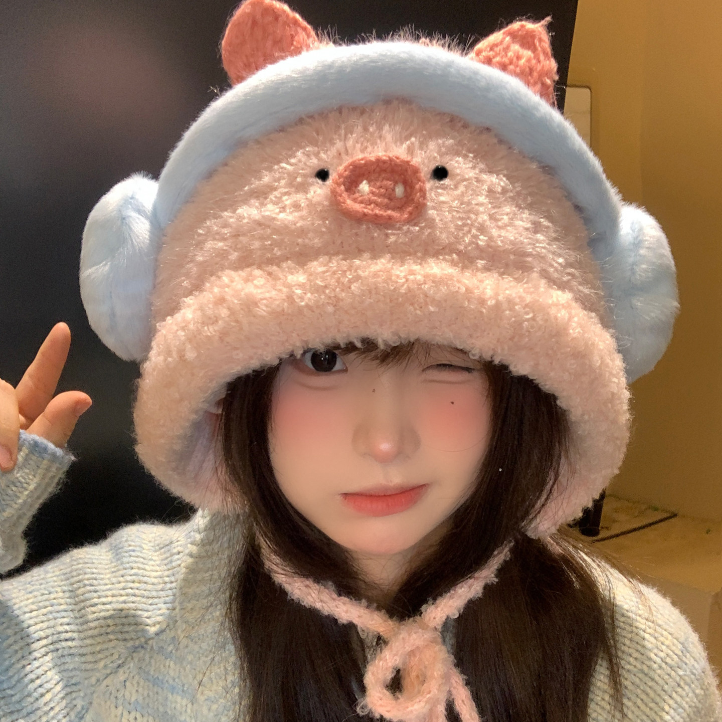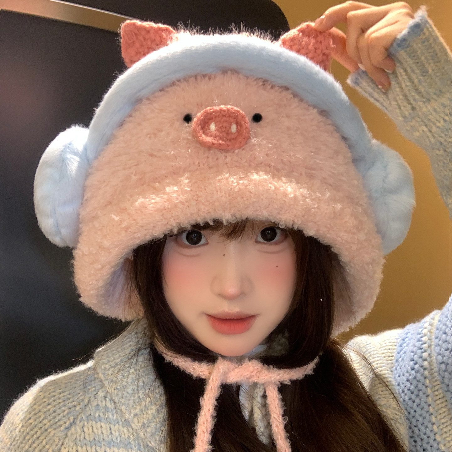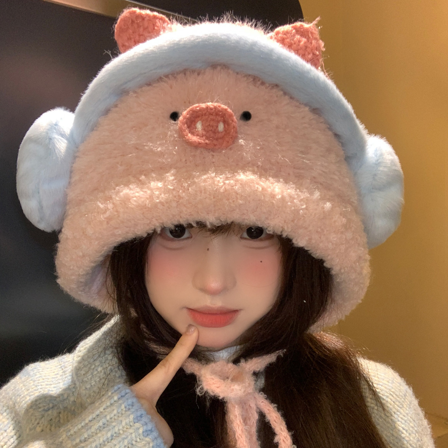 📚 可爱粉色小猪毛绒针织帽子女冬季保暖显脸小防寒护耳雷锋帽套头帽