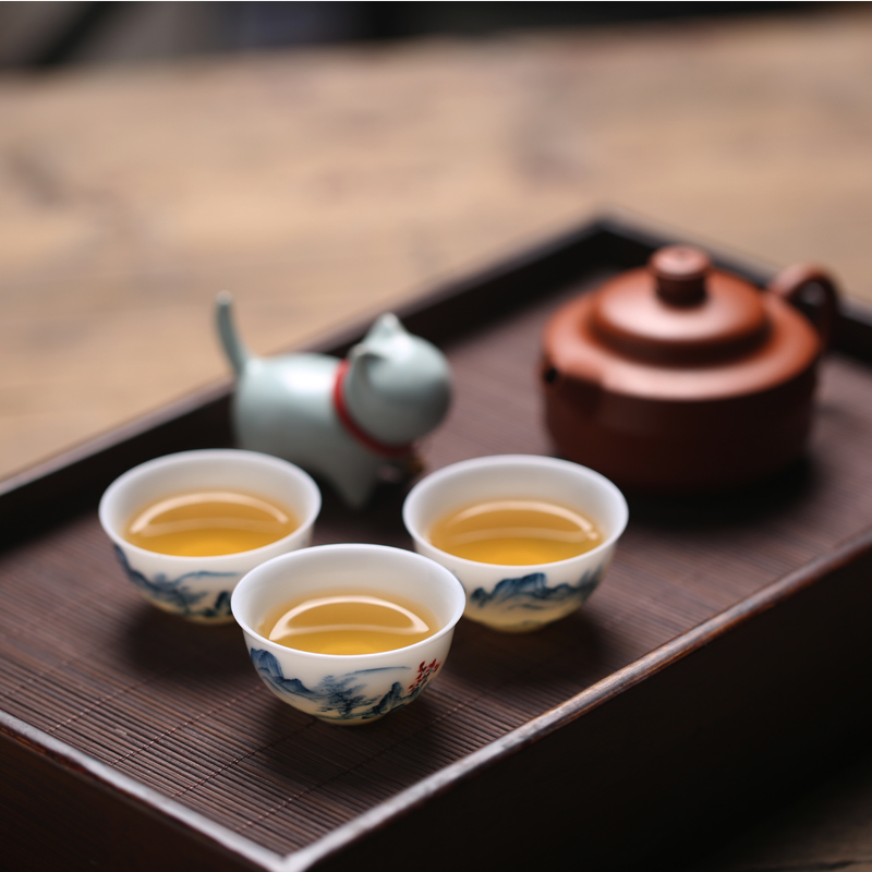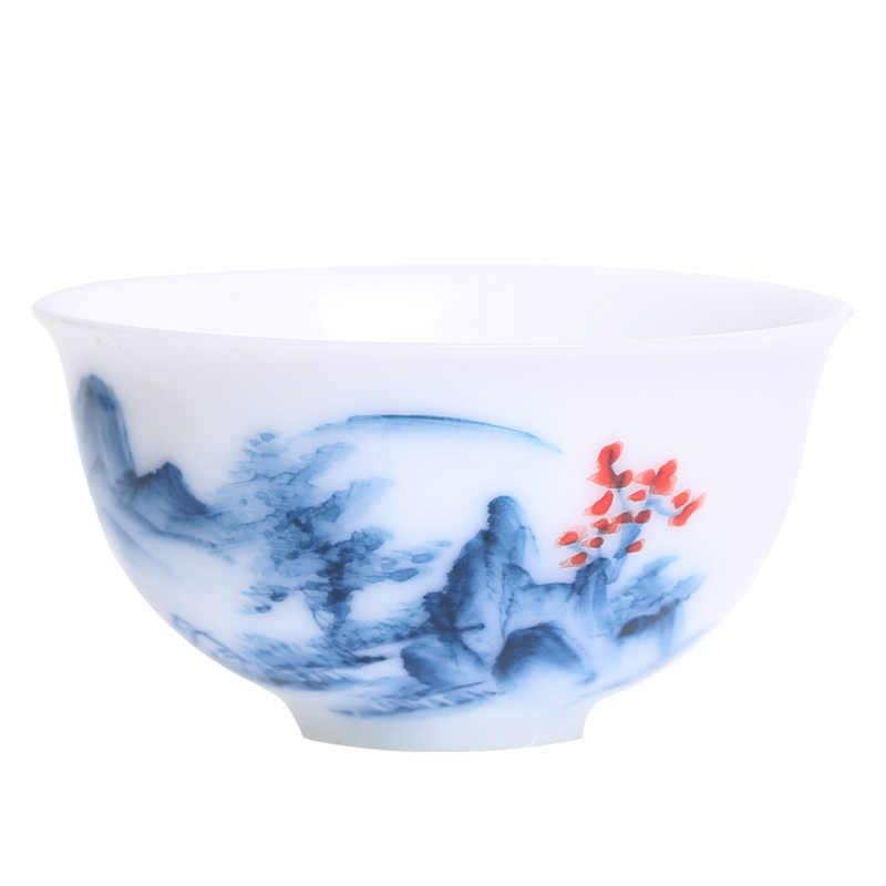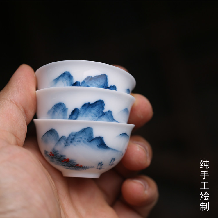 📚 纯手绘釉下彩功夫小茶杯反口杯羊脂玉高温易清洗品杯茶具山水兰荷