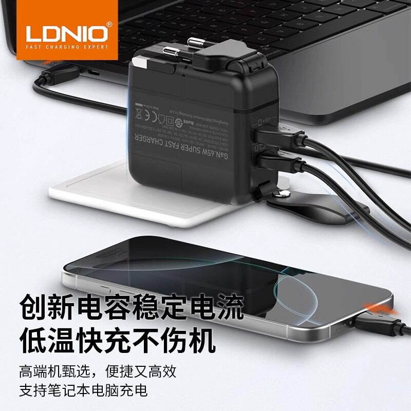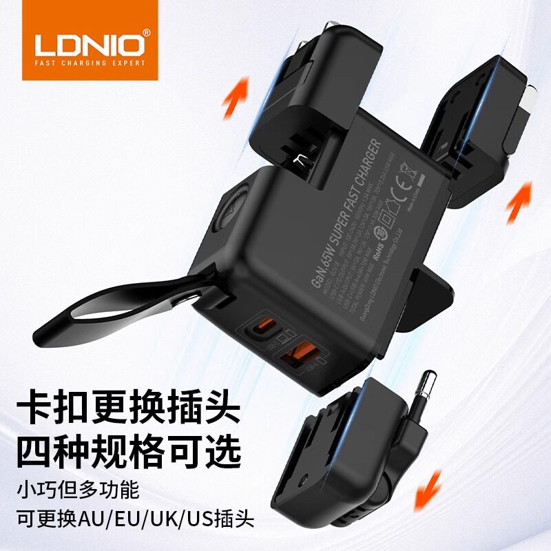 📚 LDNIO国际版65W氮化镓充电器typec双口快充pd旅行可替换插头适用苹果安卓手机平板英规澳标欧制叉电火牛gan