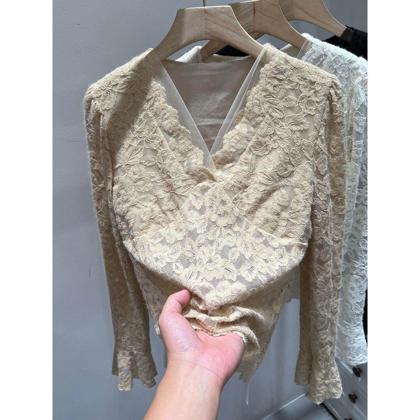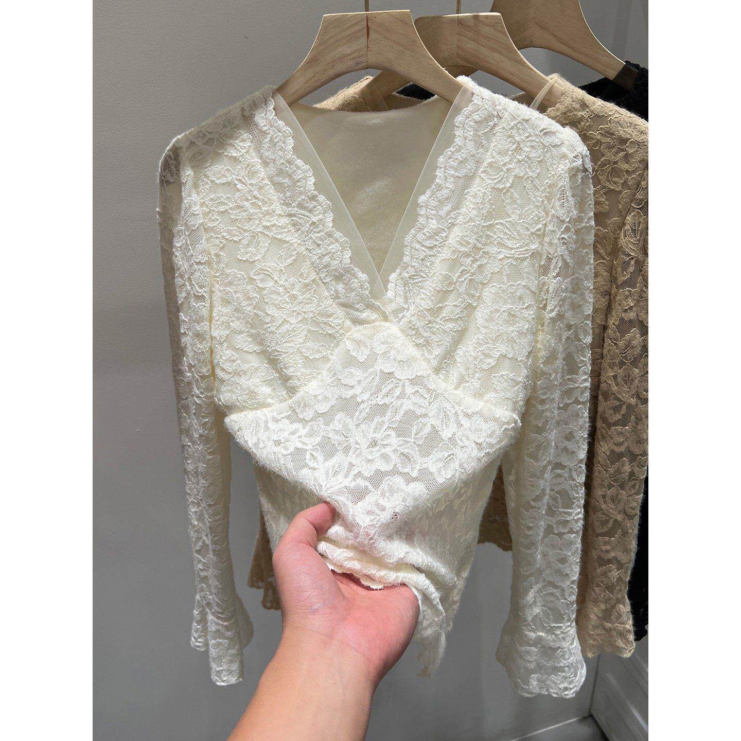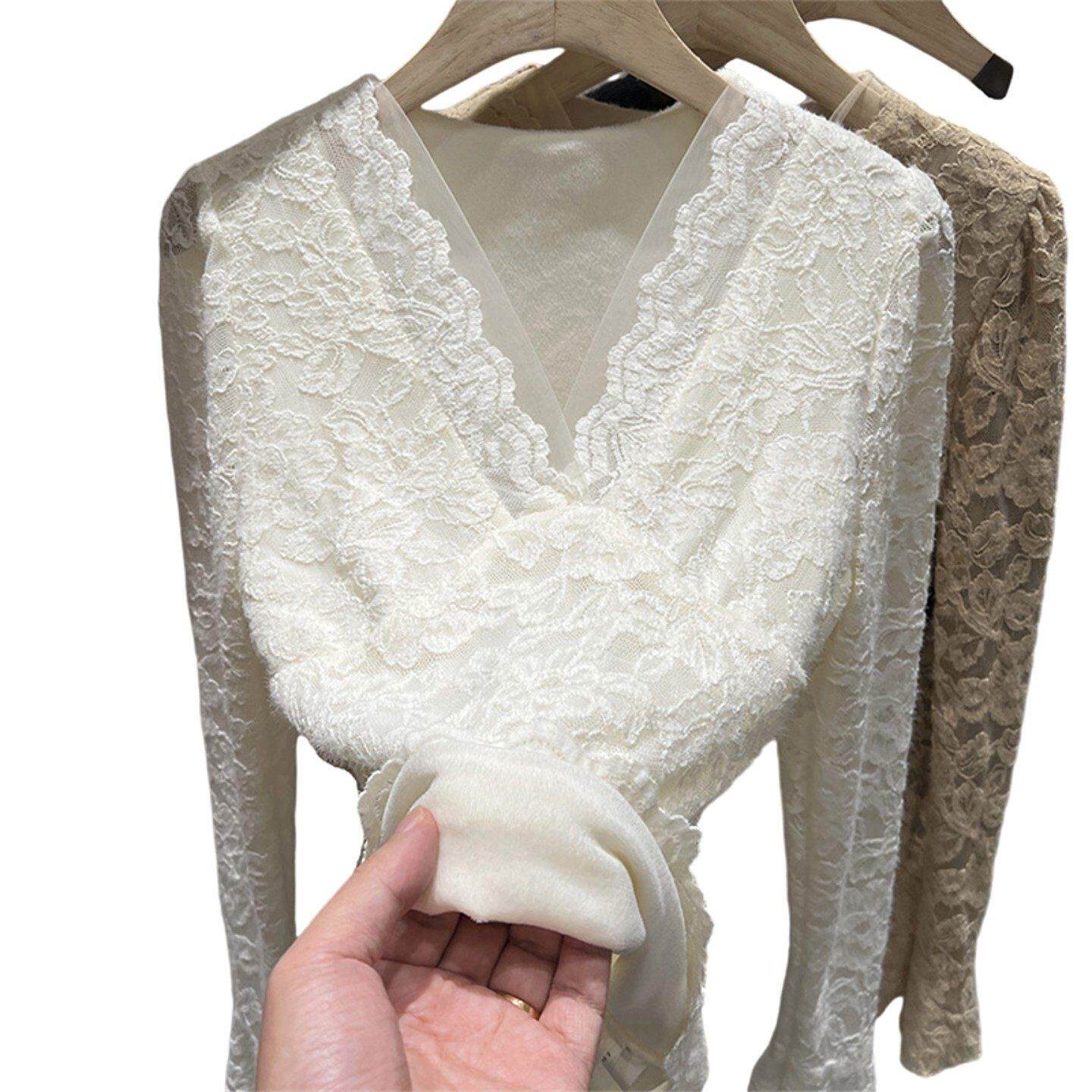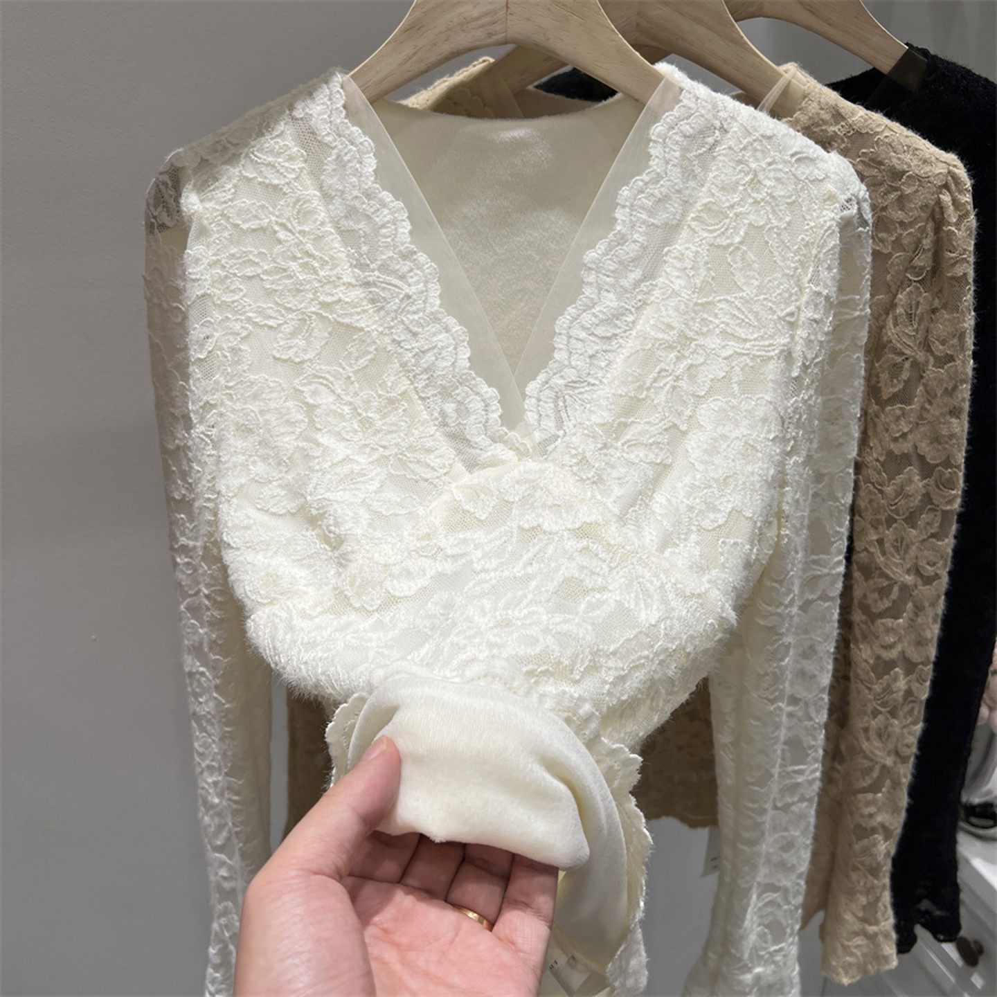 📚 网纱拼接加绒加厚V领蕾丝保暖内衣女秋冬内搭打底衫长袖保暖上衣