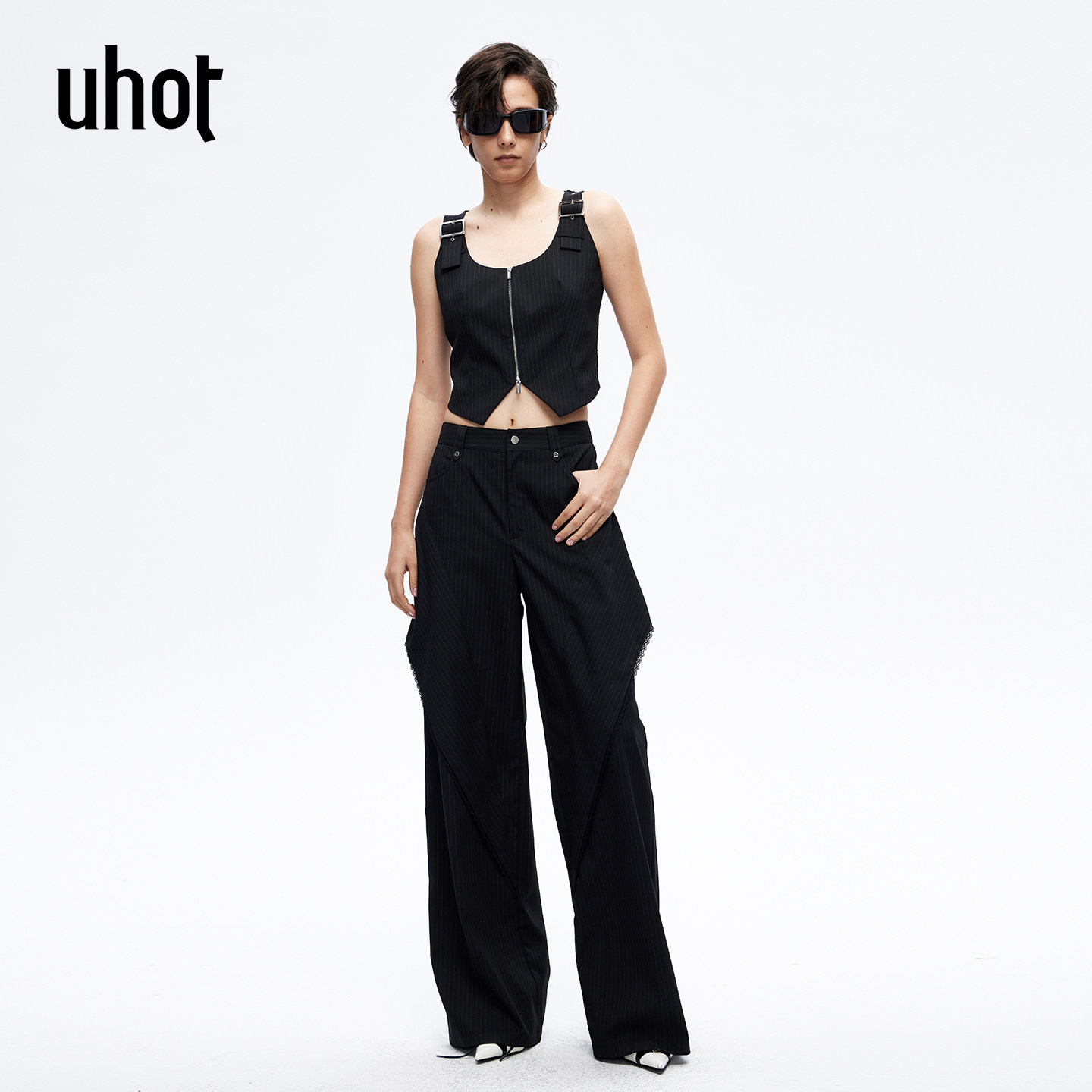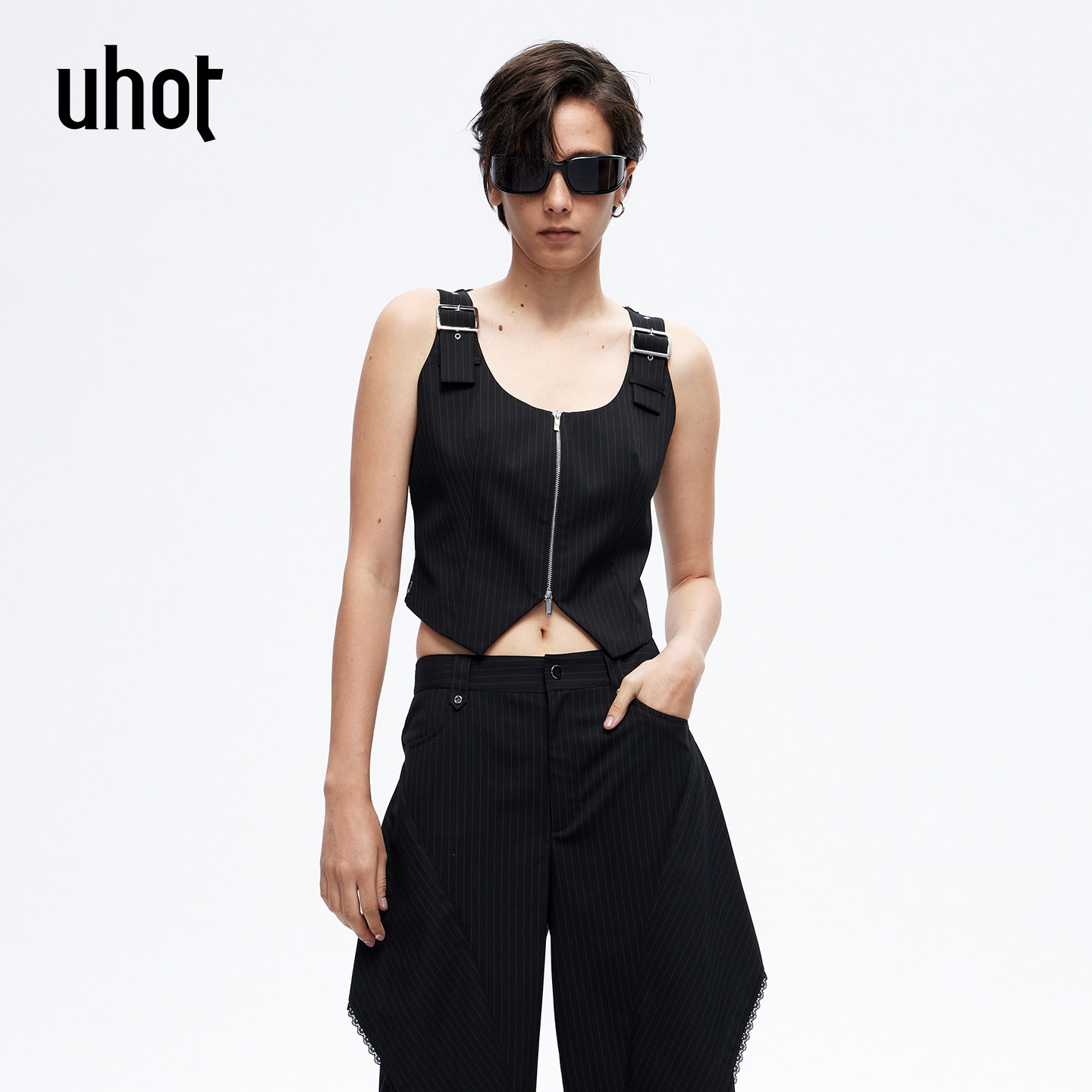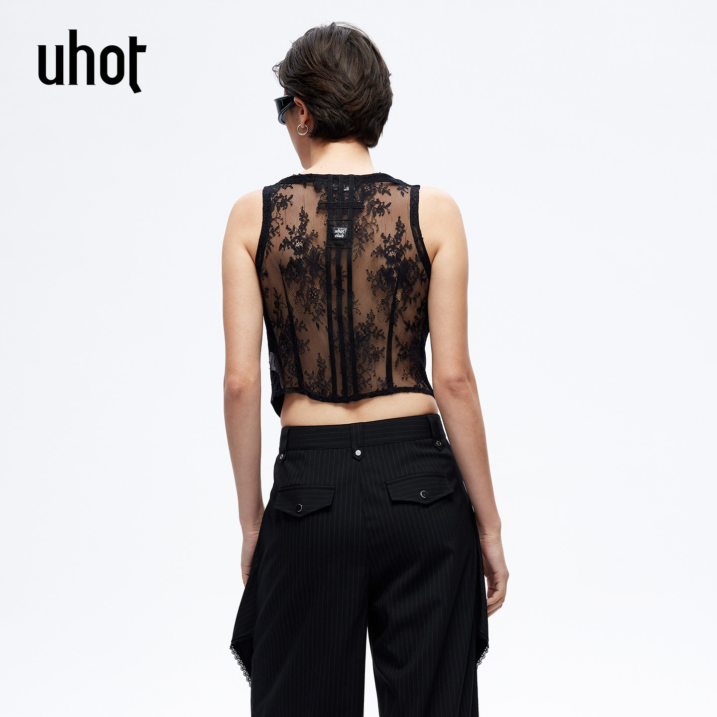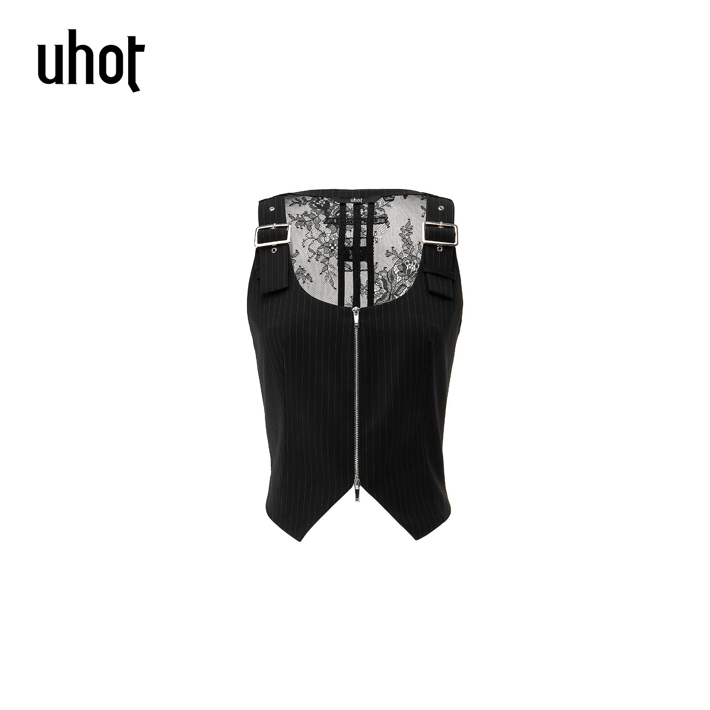 📚 uhot/诱货26春黑色条纹蕾丝拼接马甲精致修身流光甜酷风UWLS1N015