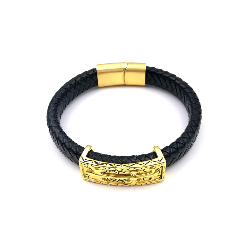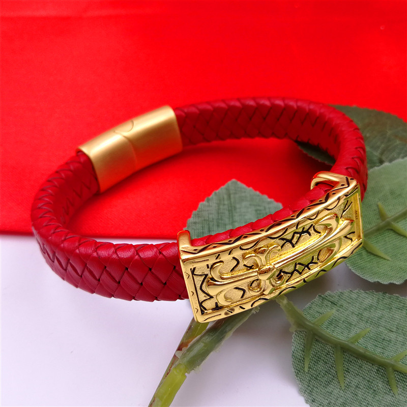 📚 马年黑皮男手绳大扁扣时尚潮牌手环手饰黄金色刺青龙牌宽面男手链