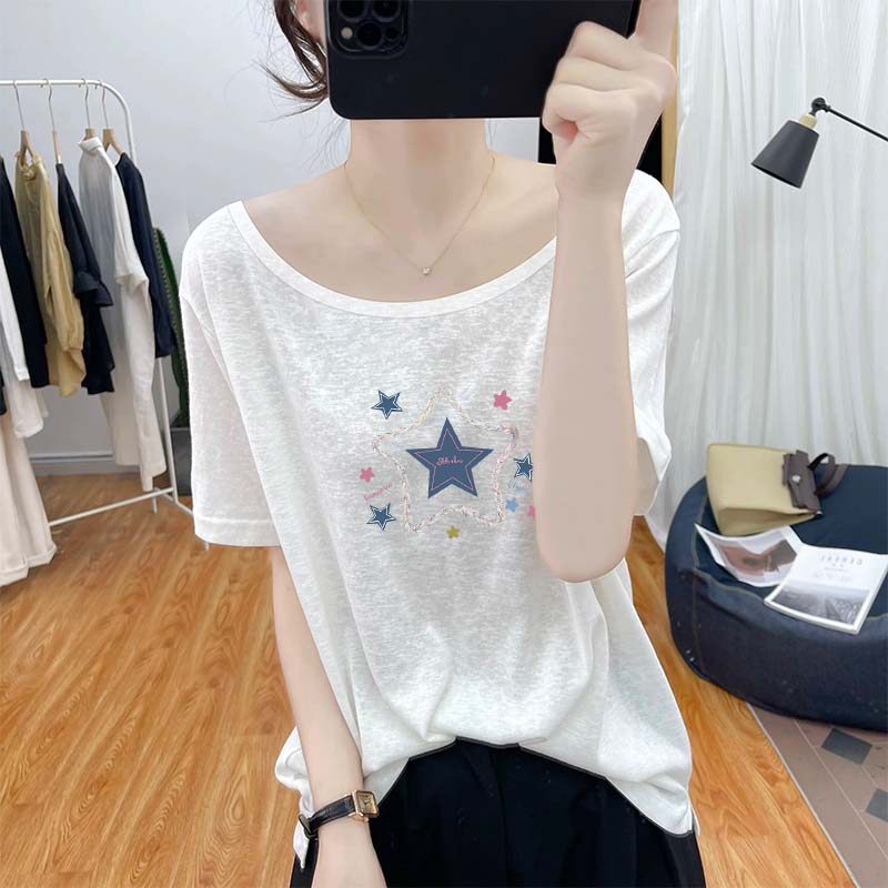 📚 夏季新款雪花棉短袖T恤女u领设计感打底衫宽松显瘦胖mm常规款上衣