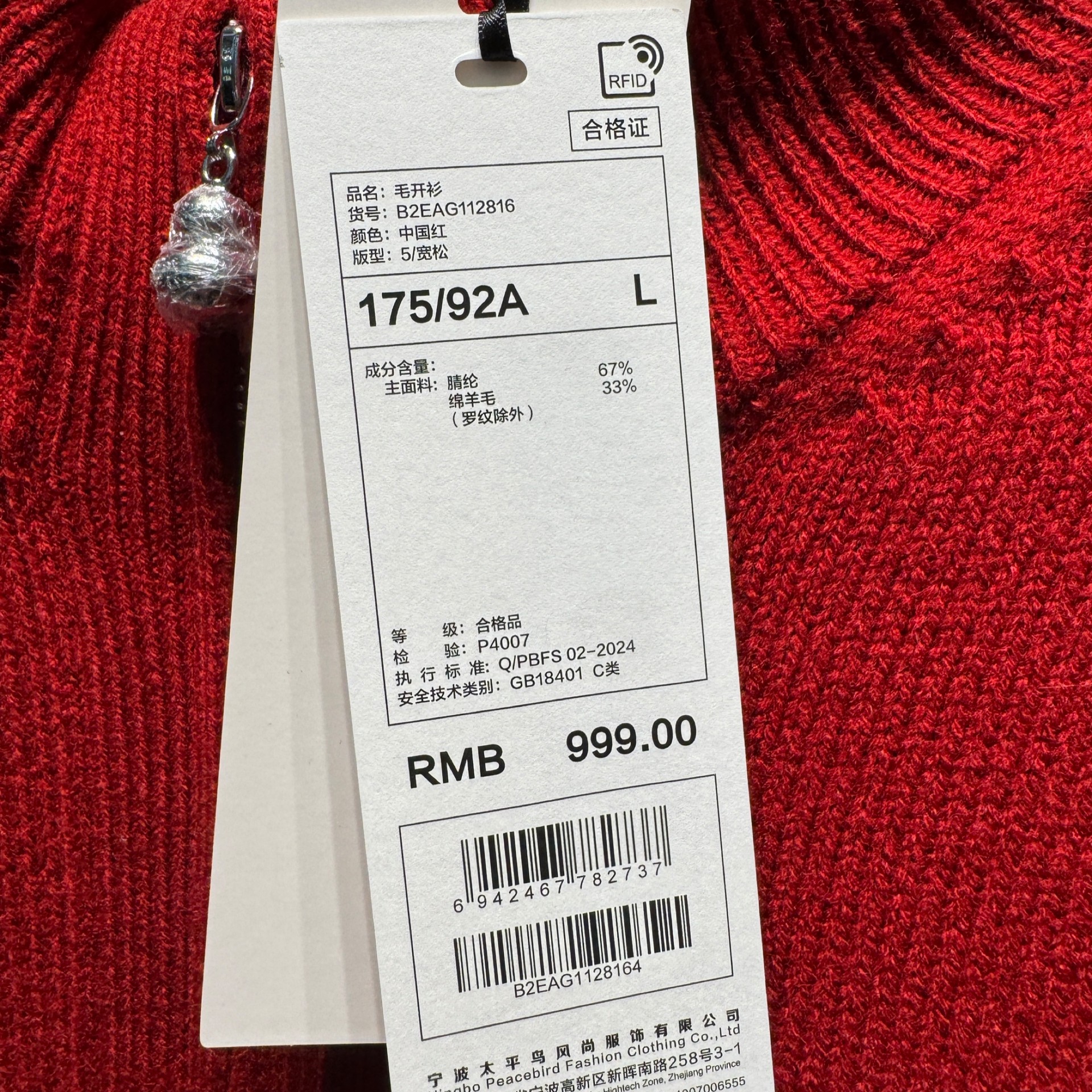 📚 B2EAG1128太平鸟男装2026春季新款B2EAG112816新年针织毛开衫 999