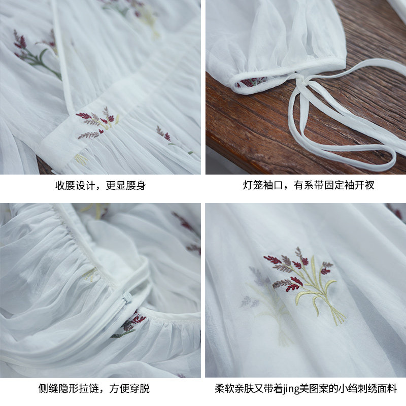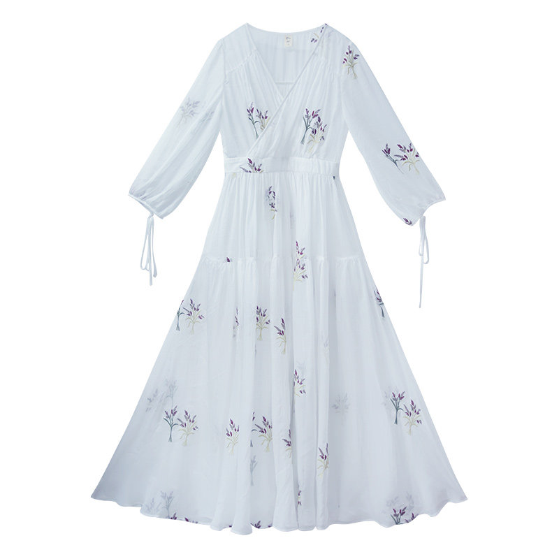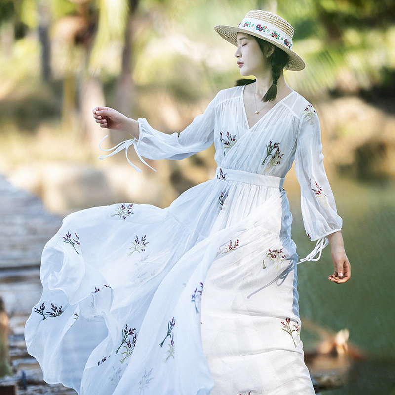 📚 【199专区】白色雪纺连衣裙女春2025年V领刺绣长裙海边度假裙子