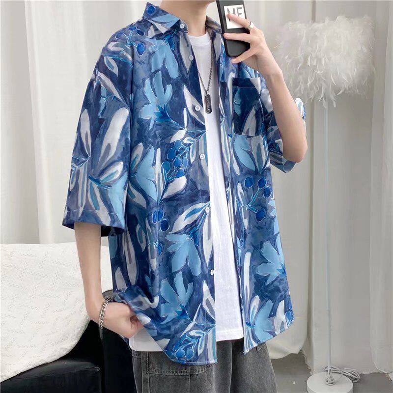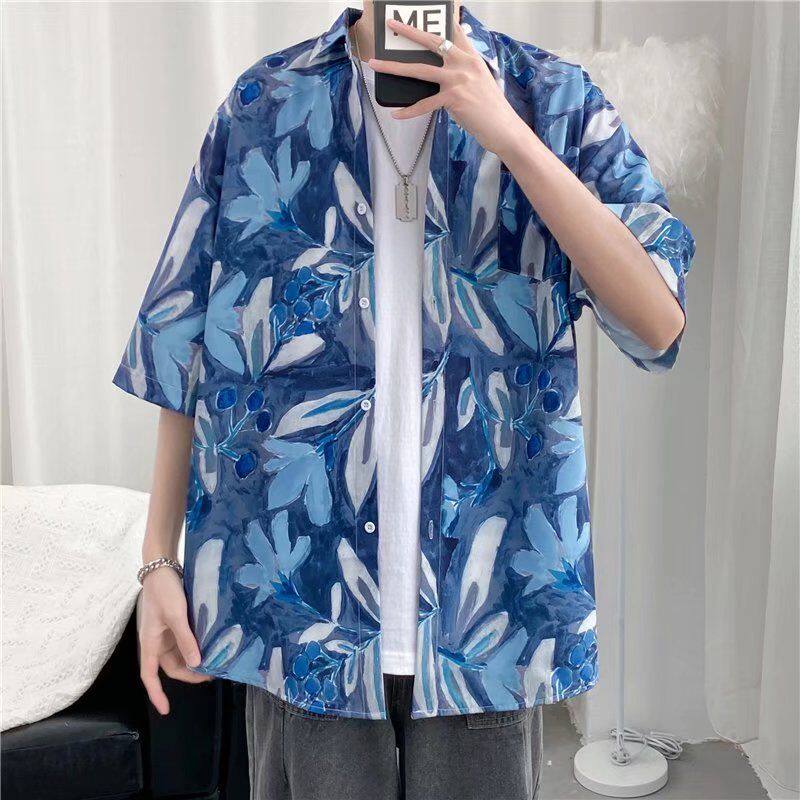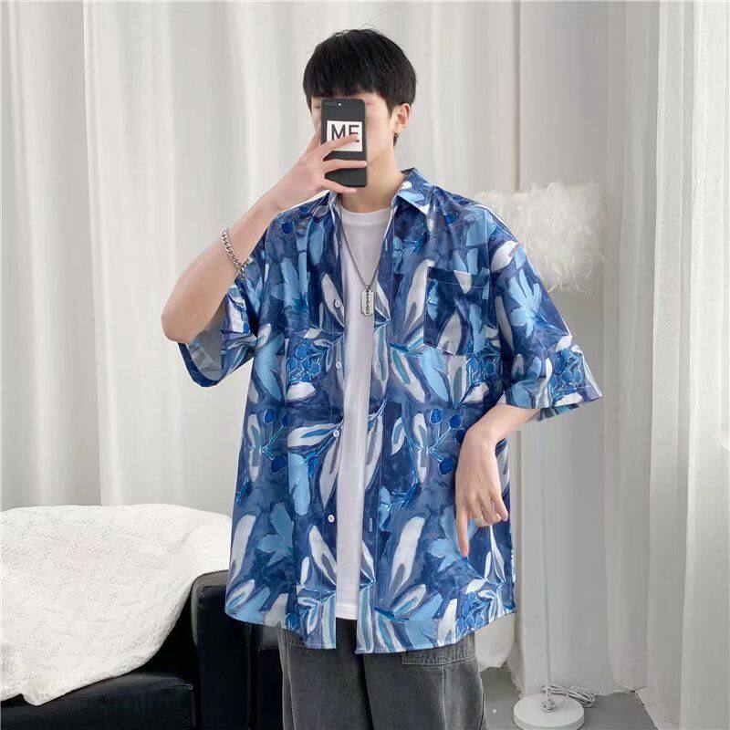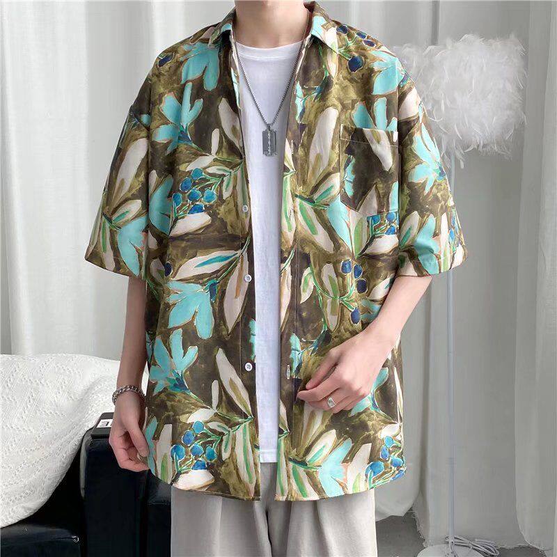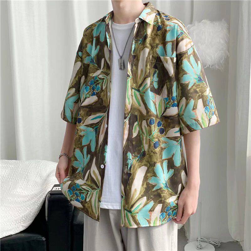 📚 港风ulzzang短袖花衬衫男潮牌ins复古风宽松衬衣沙滩情侣防晒服潮