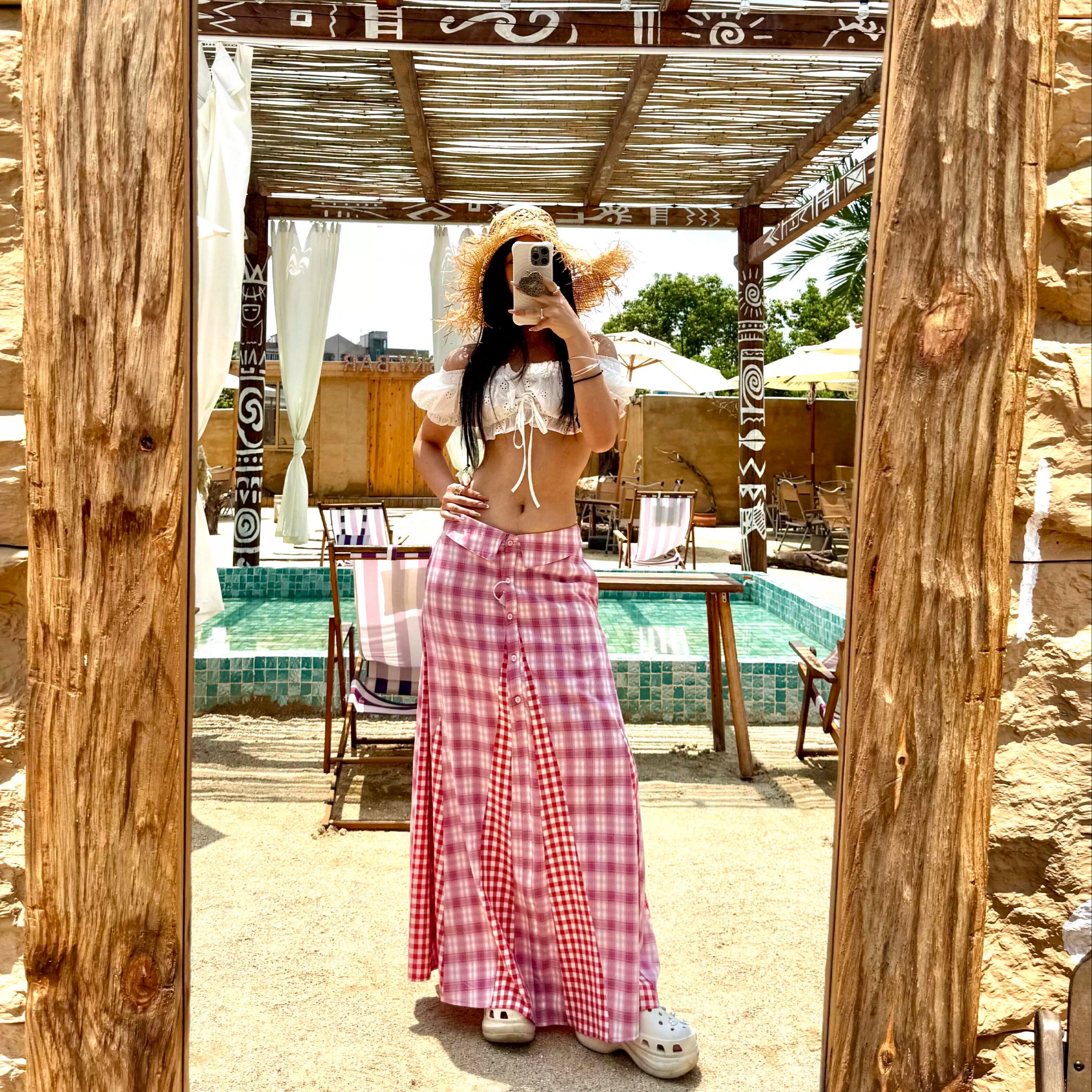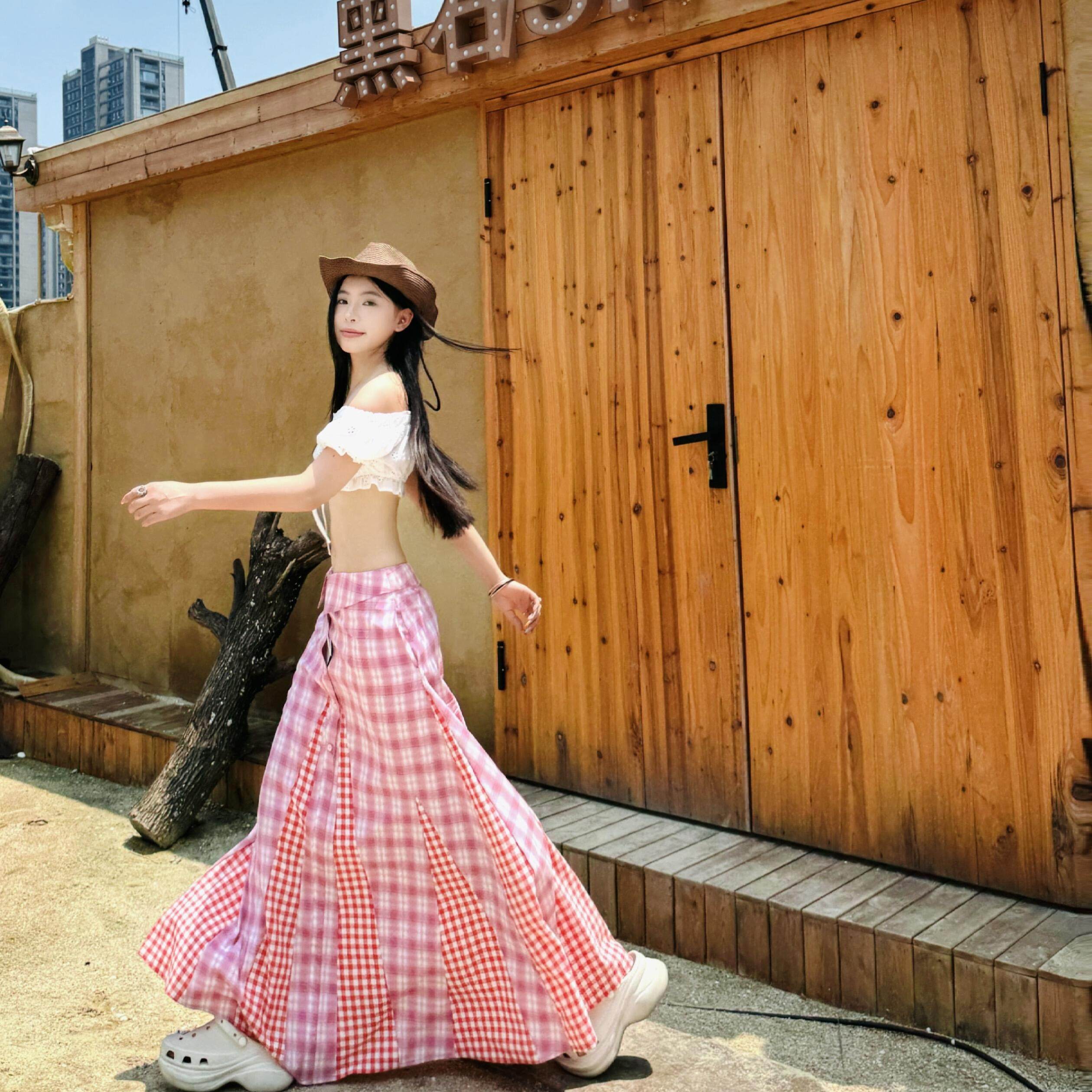 📚 海边度假风白色蕾丝一字肩抹胸上衣搭配粉色格纹半身长裙两件套装