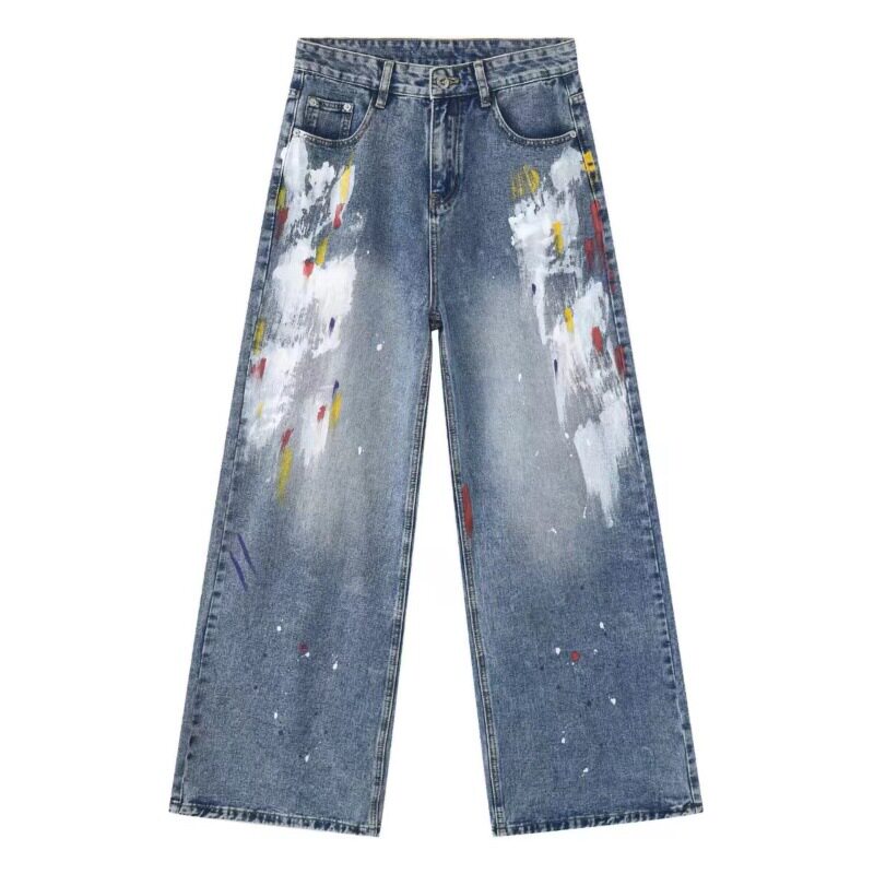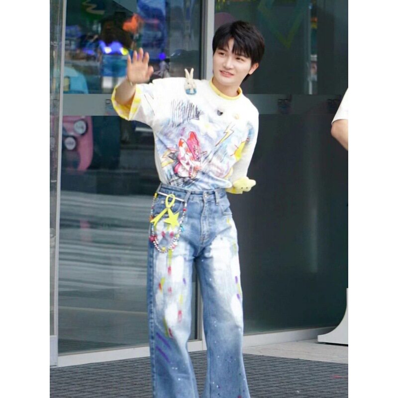 📚 明星周深同款美式设计感涂鸦牛仔裤男女直筒宽松阔腿拖地裤