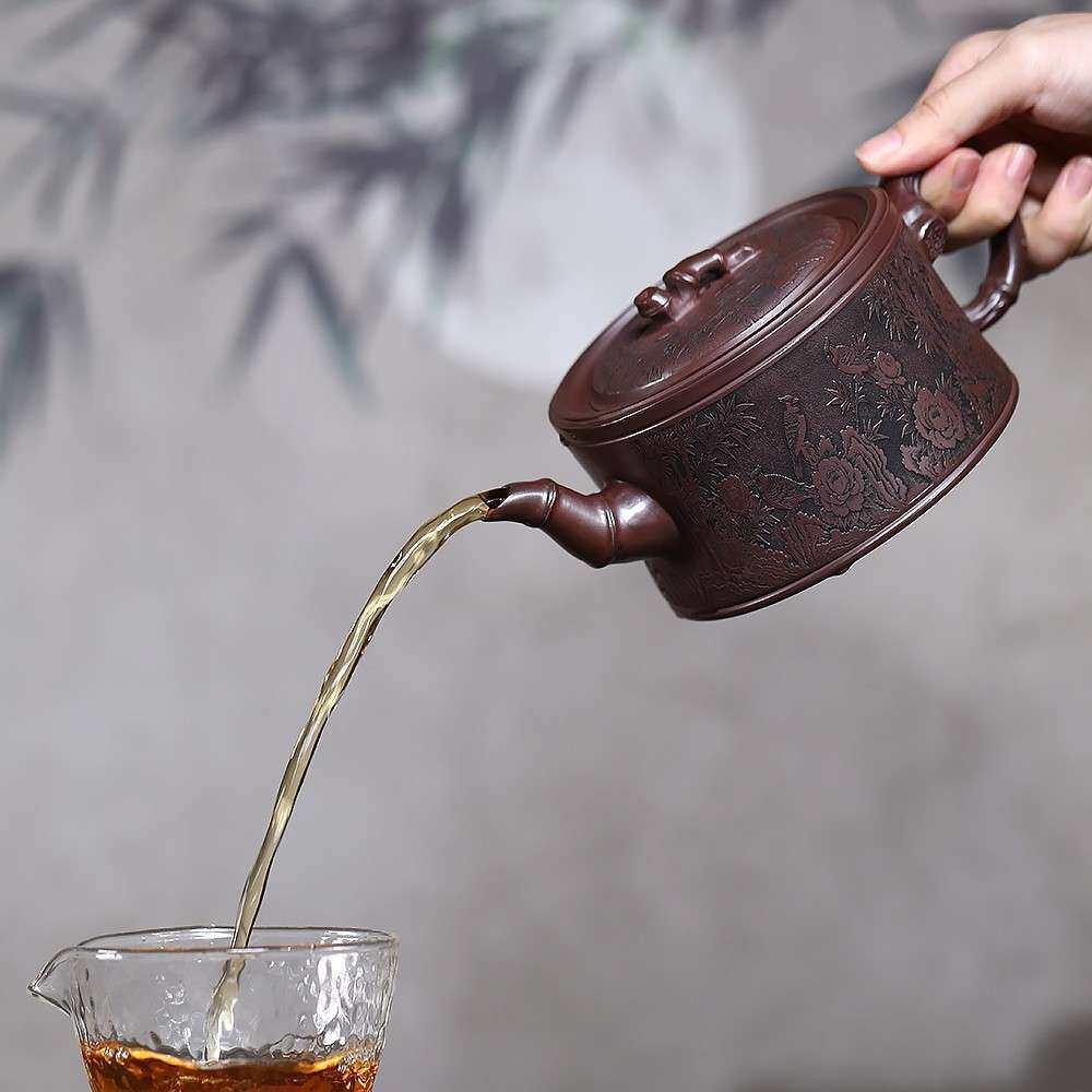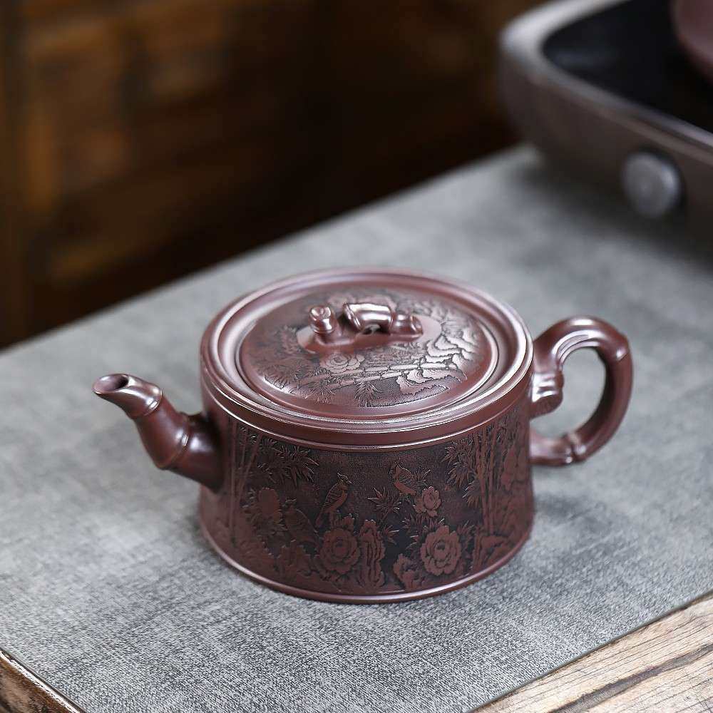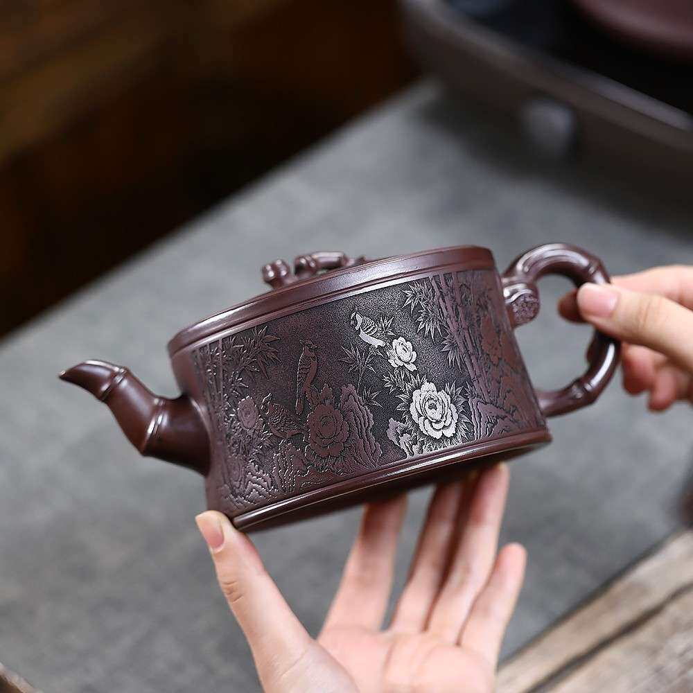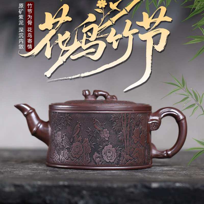 📚 宜兴紫FTN砂壶原家矿紫泥大节容刻绘花鸟竹用茶壶套装密文跨量境