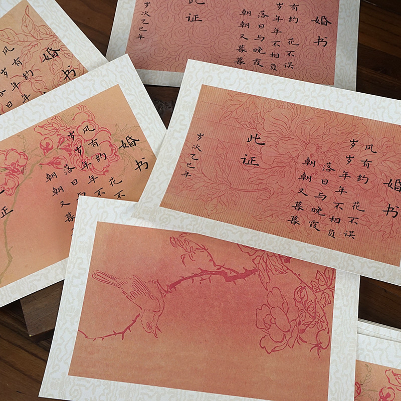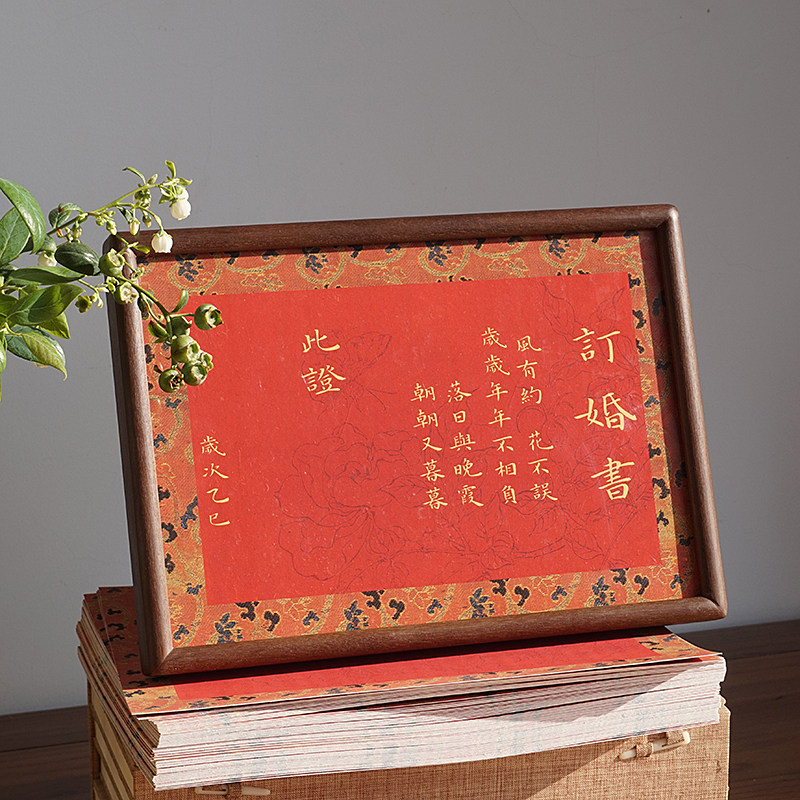 📚 A4微喷粉色深红色民国复古信笺没骨花加厚婚书空白卡纸实木相框小楷毛笔书法文创摆台半生熟宣纸画心