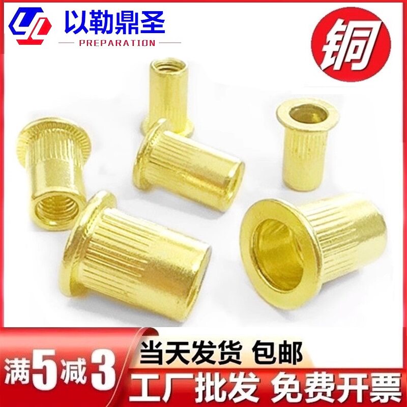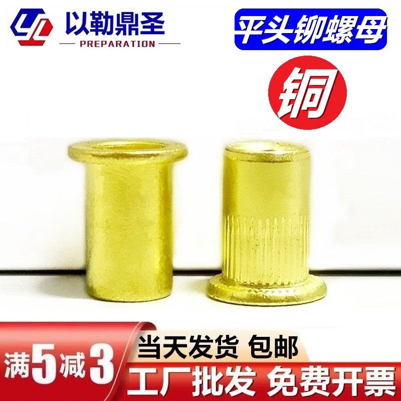 📚 铜质平头圆柱铆螺母竖纹拉帽铆黄铜光面锚接拉母螺母M5M6M8